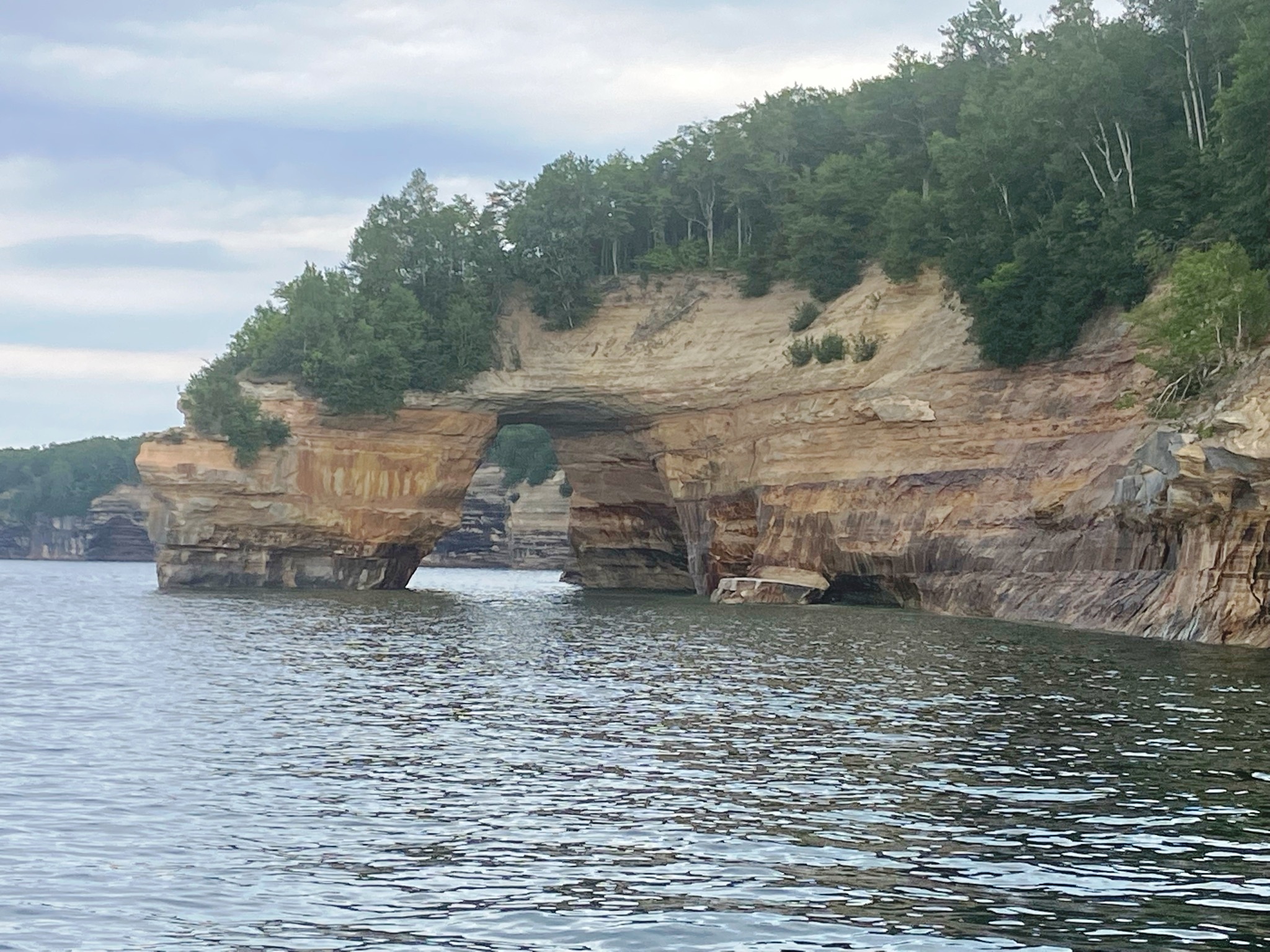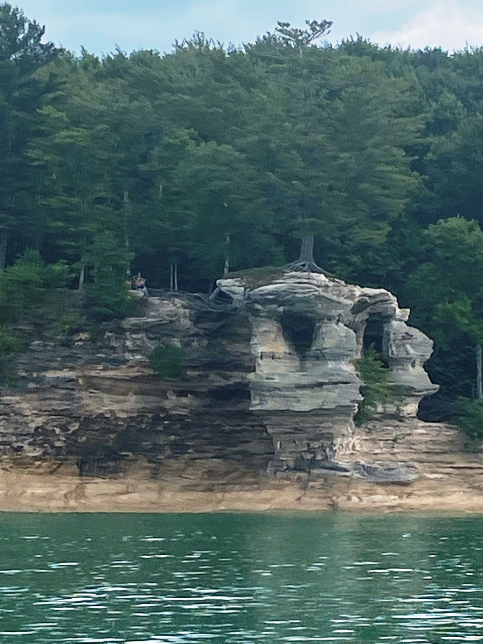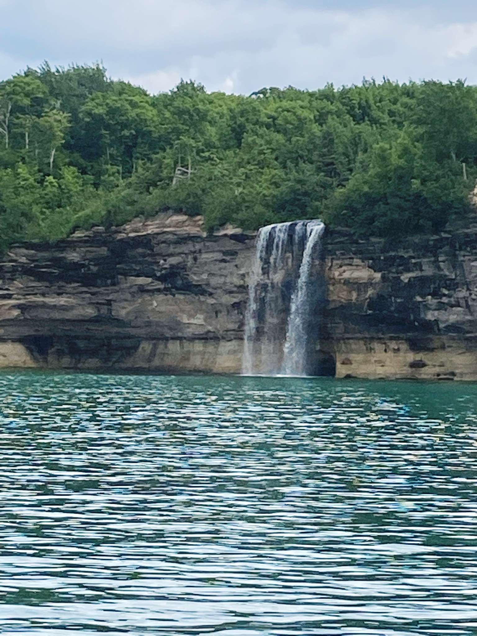 Siri took us on a surprisingly pleasant detour on Federal Forest Highway 13 to the AmericInn in Wetmore, MI. We checked into the hotel and drove just a few miles to board the Pictured Rocks Express in Munising, MI. The forecast called for overcast skies and rain, but the scattered rain showers never hit when we were outside. Pictured Rocks are beautiful! The way the wind and the waves have carved caves and tunnels into the rock is amazing. The colors from the iron, copper and other minerals are brilliant in the rock and in the water. Waterfalls and a cool old lighthouse. It was a great tour!