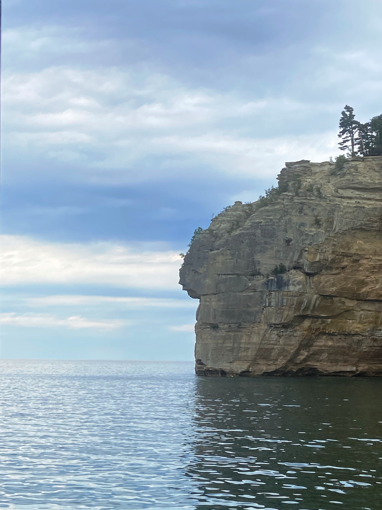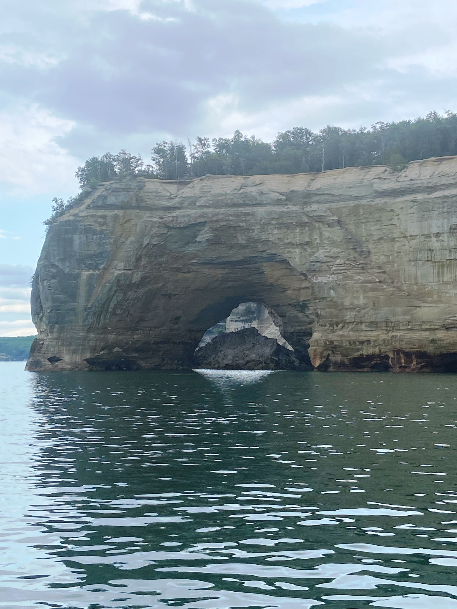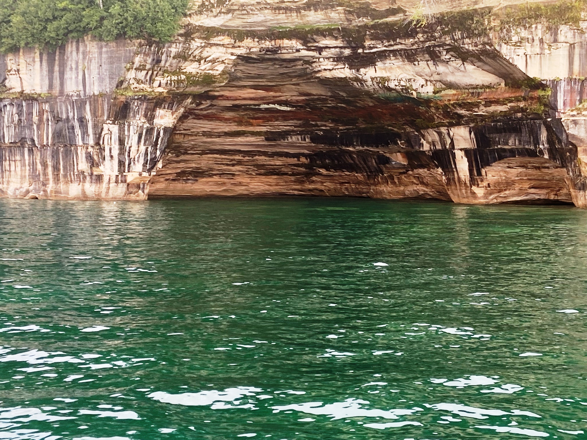 Siri took us on a surprisingly pleasant detour on Federal Forest Highway 13 to the AmericInn in Wetmore, MI. We checked into the hotel and drove just a few miles to board the Pictured Rocks Express in Munising, MI. The forecast called for overcast skies and rain, but the scattered rain showers never hit when we were outside. Pictured Rocks are beautiful! The way the wind and the waves have carved caves and tunnels into the rock is amazing. The colors from the iron, copper and other minerals are brilliant in the rock and in the water. Waterfalls and a cool old lighthouse. It was a great tour!