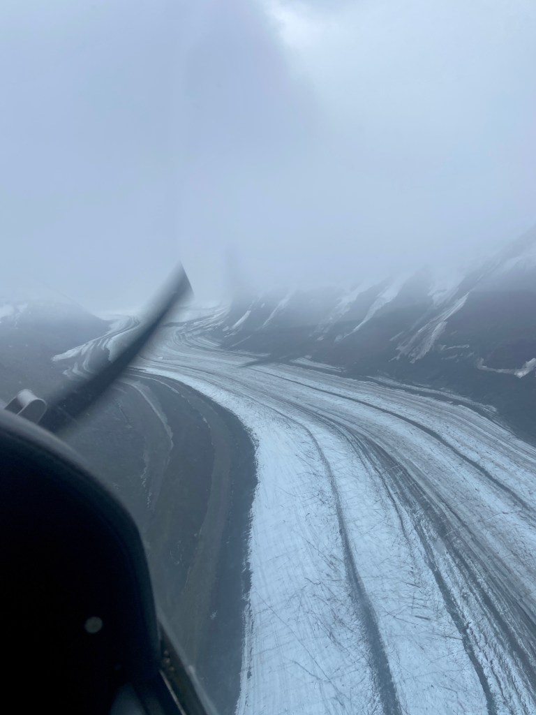 Up early to board the Fly Denali shuttle bus to the Healy River Airport. With the poor weather conditions, we toured the Alaskan Range instead of Denali. Disappointing, but we can’t control the weather. With the bad ice conditions on the glacier, we were not able to land on a glacier. Several other people canceled, so they took us and two other guys up in a very small plane, very uncomfortable for Linda in the back. To balance the weight, I rode in the co-pilot seat of this Cessna 185.