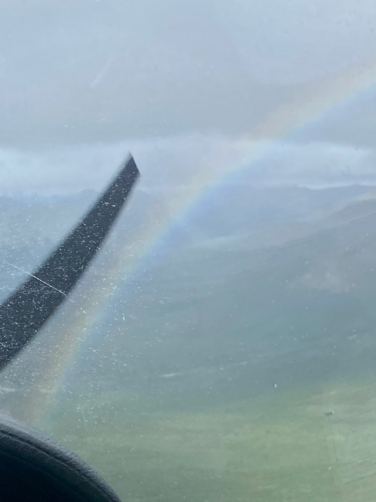 We flew through some light snow and turned around before the heavy snow hit. The rising sun glistened in the snow over a glacier. Snow in late July!