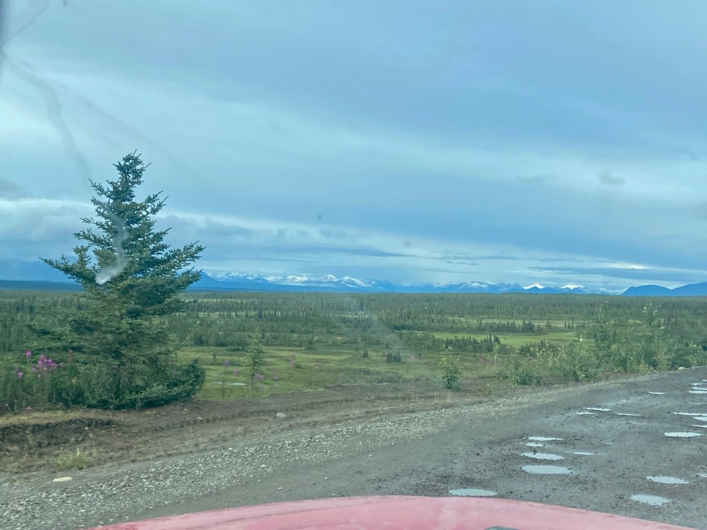 Rain stopped, so we walked down to the Denali Highway Jeep Excursions office in Denali Canyon. Met our energetic Jeep tour guides Noah and Joe. Took a shuttle bus to the Jeep lot. We were assigned a Red 4-door Jeep Wrangler. We followed the Park Highway south to the start of the Denali Highway, which is a rough gravel road with beautiful views of the Alaskan Range.