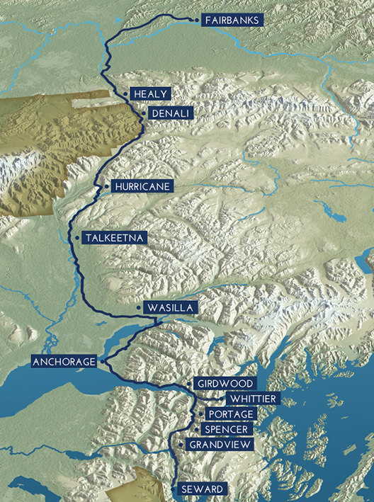 After steady rain all night, the rain stopped as we checked out of our cabin and Bill, the owner of the cabins took us to the Talkeetna train station. For many years, the Alaskan Railroad was the only means of transportation to get from Seward to Anchorage to Fairbanks and past Denali National Park. The train is very clean, comfortable and roomy way to travel. We enjoyed to the Gold Star train with the large windows, perfect for viewing wildlife and the beautiful scenery. The map below shows the full route.