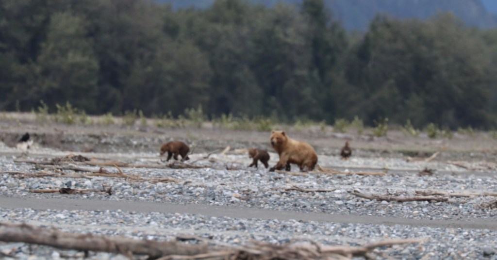 The thrill of the day was watch a big brown bear with two cubs walking towards our rafts. When they got too close, one of the guides stood up and yelled at the bears. The momma bear stood up and saw us and started running away, with the two cubs following behind. It was amazing to watch this big bear run so fast over rocks, mud and water. What a thrill! Watch the video.