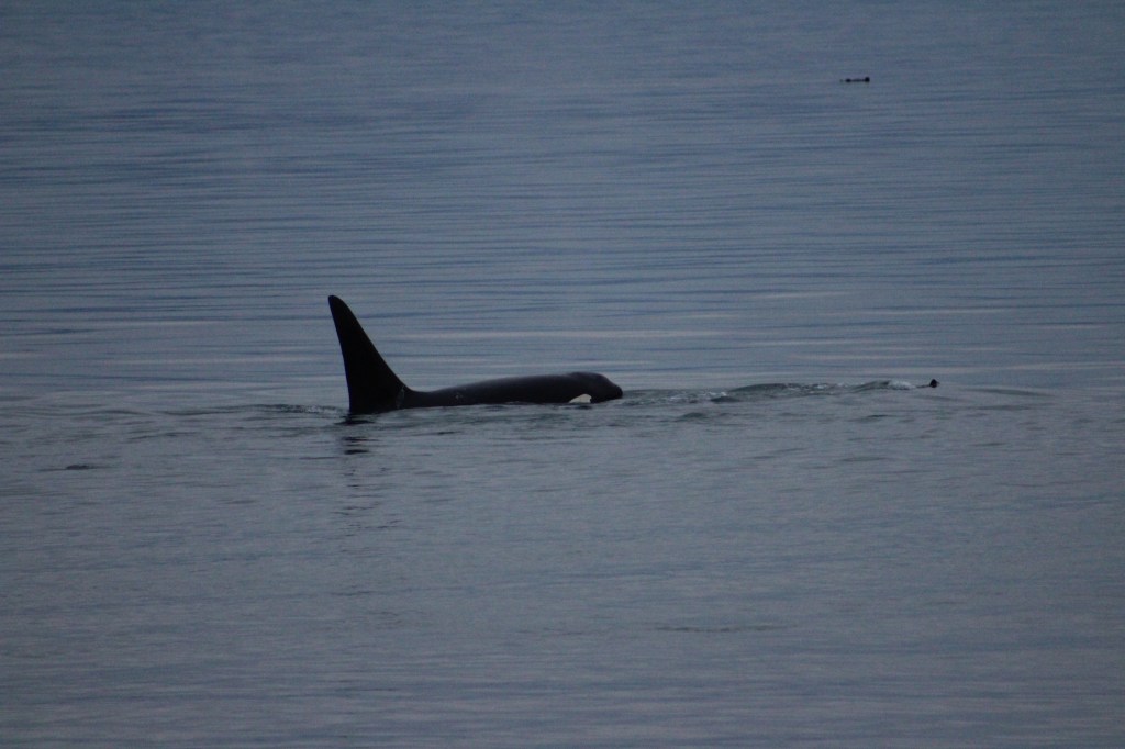 Just after we had gotten ready for bed, the announcement was made that the killer whales were feeding in front of the ship. I jumped up, got dressed, grabbed my iPhone and binoculars to watch quite a show. Saw 7 killer whales, including 2 small whales and 1 very large whale with a huge backfin.