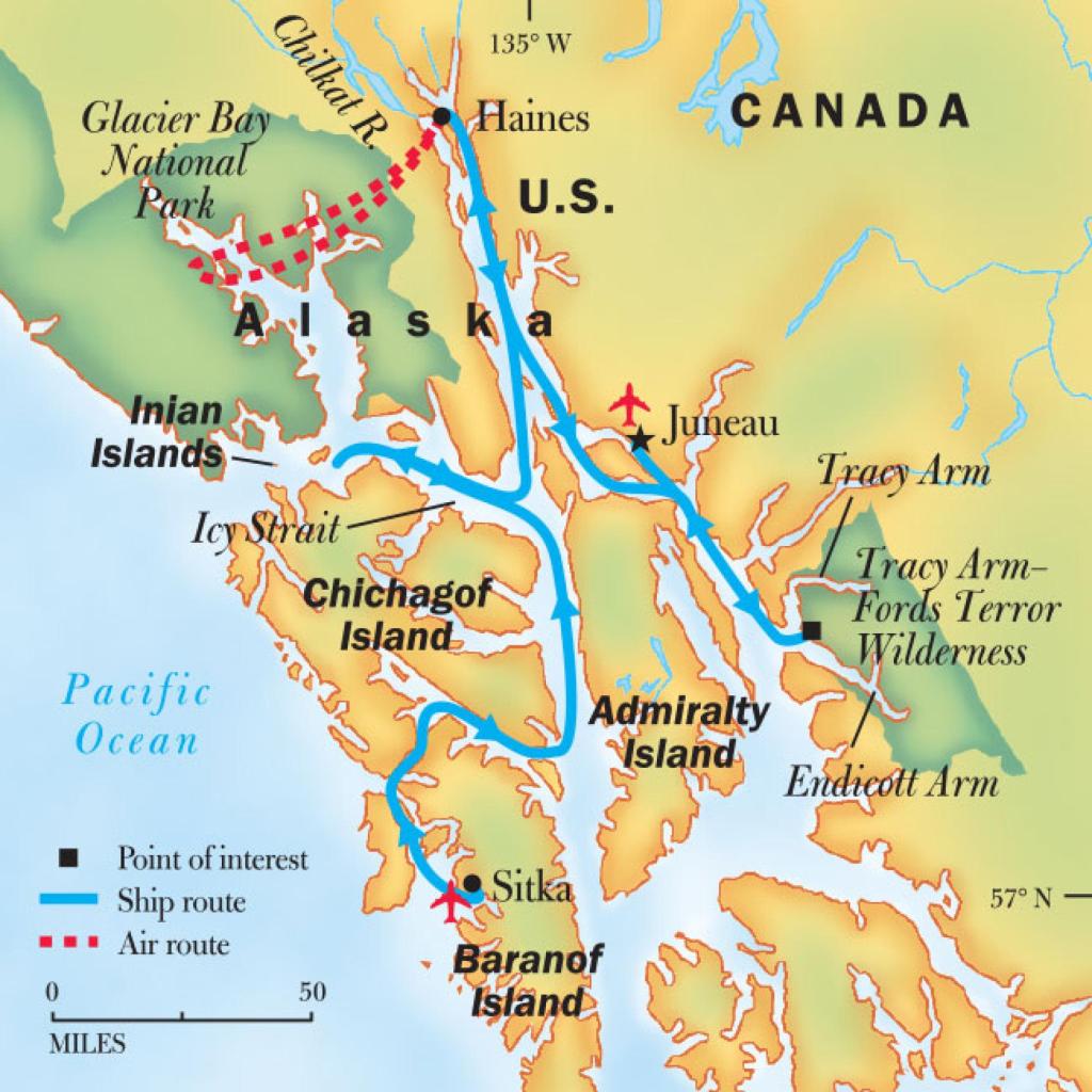 Traveled north of Sitka Sound through narrow channels to Salisbury Sound. Then east through the Sergius Narrows. Can’t believe this ship can travel through such narrow channels. Overnight the ship headed southeast through Peril Straights before turning north on the Chatham Straight. The map below shows the complete route.