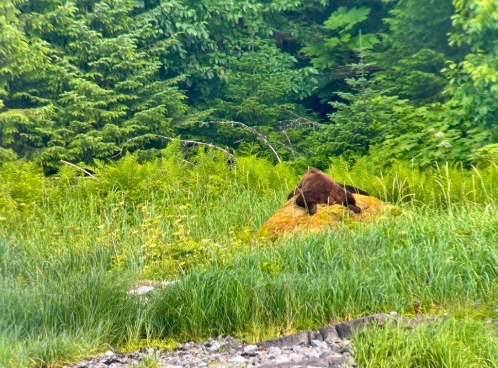 We spotted a big brown bear stretched out on a rock along the shore. He didn’t move much, looked pretty comfortable.