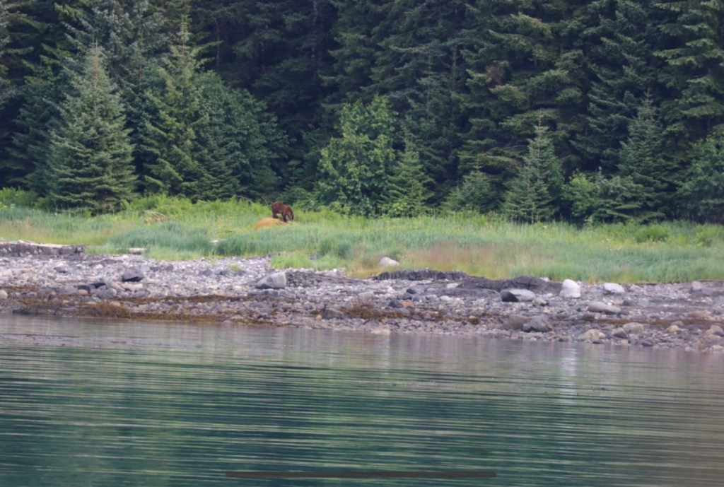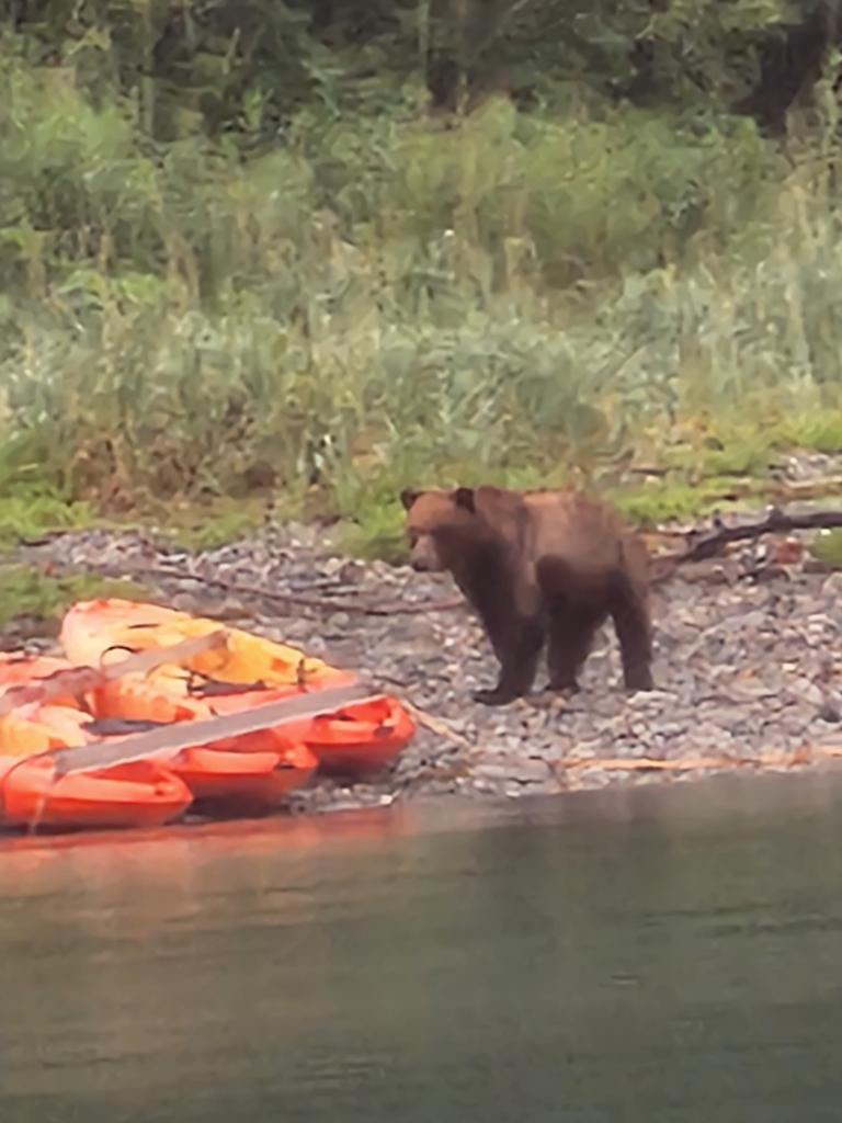 As I paddled back towards shore, I noticed all the Zodiacs zooming towards shore. Something was up! A large bear came out of the woods to check out the kayaks and the staff on the beach. Even with all of yelling and the sound of the Zodiac motors, the bear was not scared away.