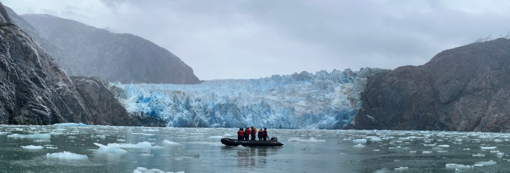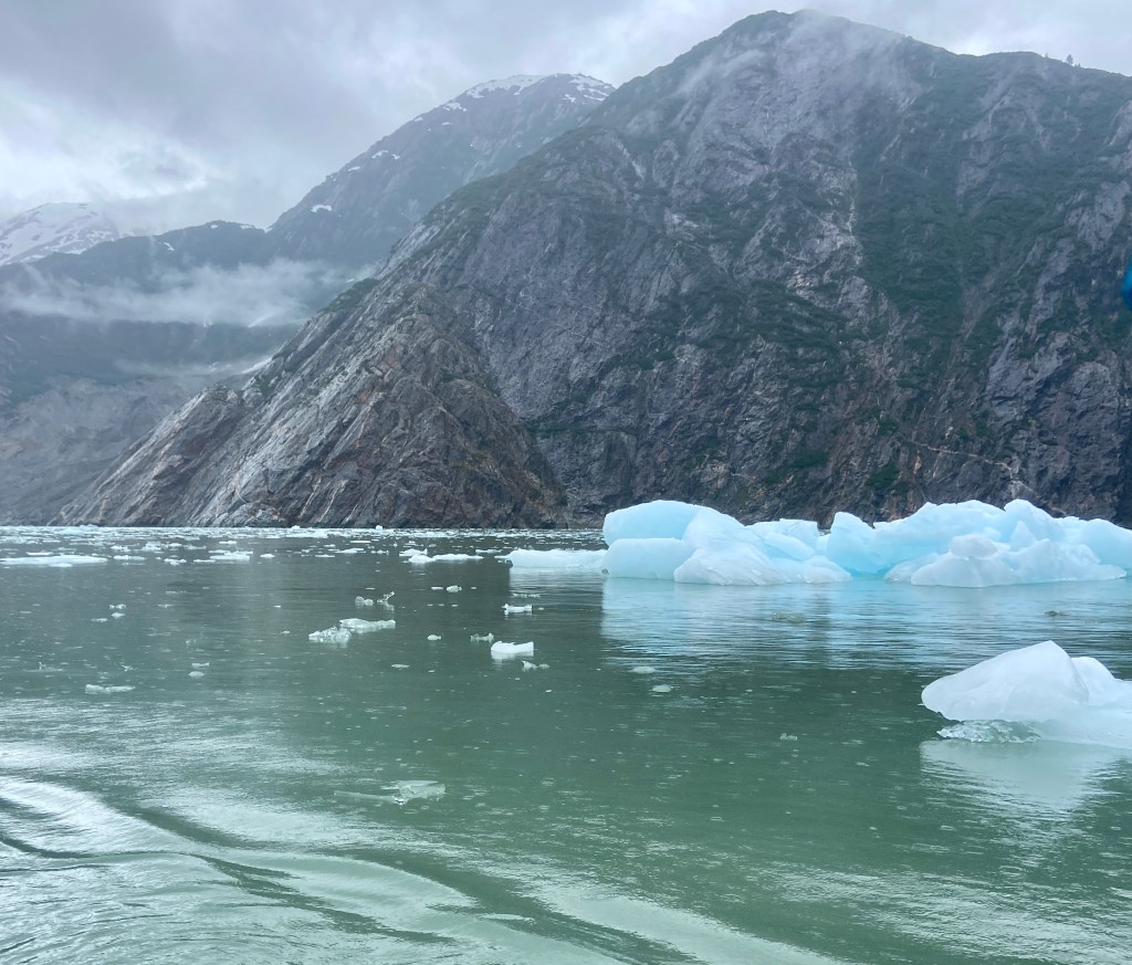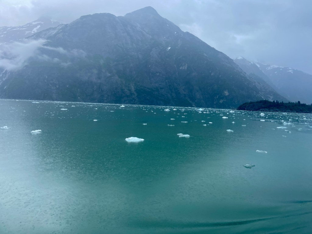 Woke up in Tracy Arm Fords Terror Wilderness. The ship was dodging icebergs as we approached South Sawyer Glacier. Cooler 45 and rain as we went past countless waterfalls coming down from the steep cliffs.