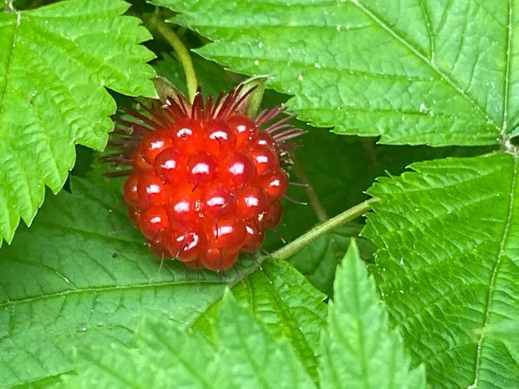 We walked along the harbor and then hiked through the rest of Sitka National Historic Park located across the Indian River from the Totem Trail. This less traveled area is filled with huge old spruce trees as well as many bushes filled with different berries. Yellow and red salmon berries and blueberries.