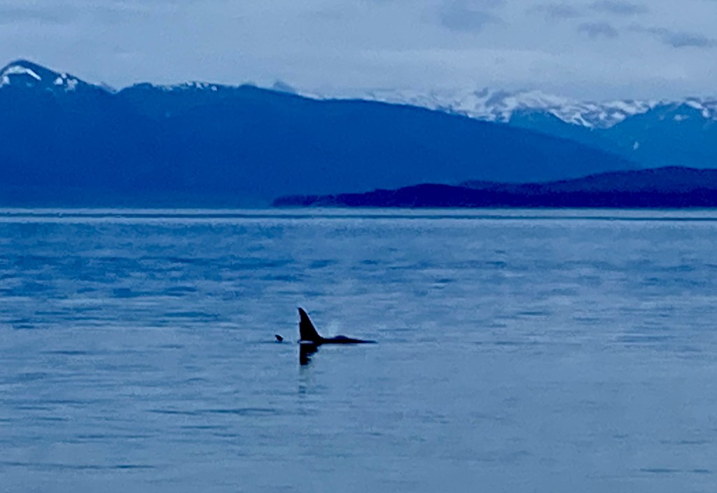 Dessert was interrupted by the sighting of killer whales near shore inside Glacier Bay National Park. The ship is not permitted to get close to shore. Saw a harbor porpoise.