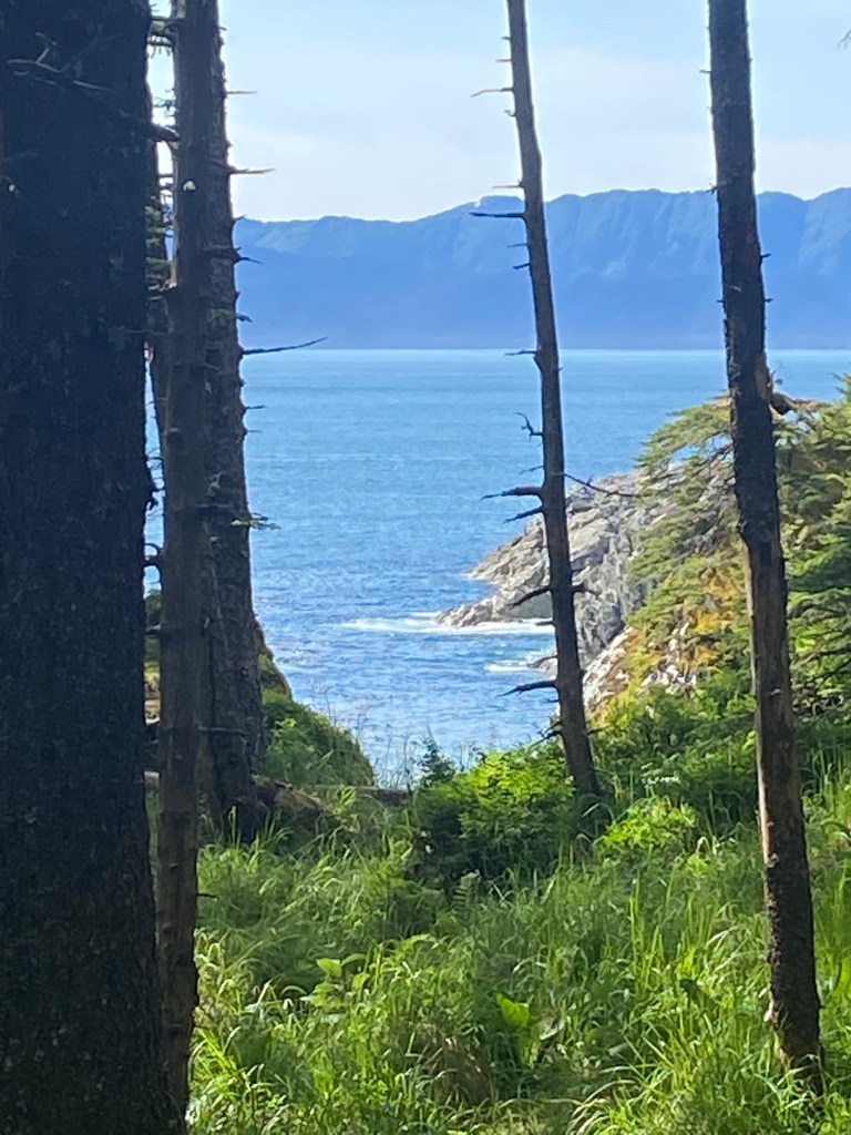 We hiked up the mountain along the Indian River until we reached Sitka’s Cross Trail which stretches above the town before heading back down the mountain into town. It was a beautiful hike! Huge cedar and spruce forest.