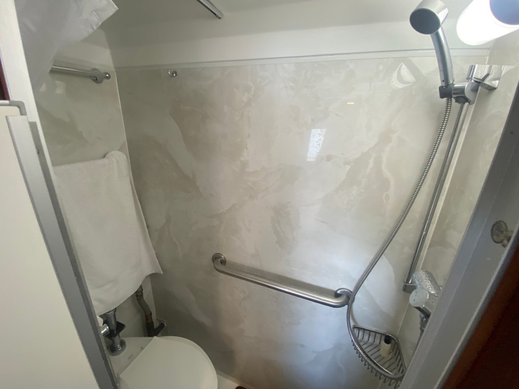 Back on the bus to board the ship. Room 219 is a little bigger. Having a queen bed, a small table, two chairs and two windows is nice. The bathroom/shower combination was small, but we had everything we need.