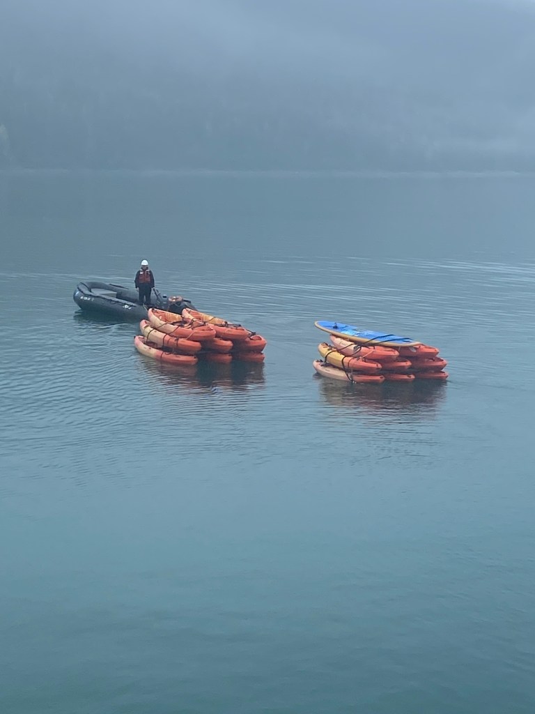 After lunch, we pulled into Williams Bay, a quiet cove, perfect for kayaking. The staff used a crane to lower the Zodiac s and kayaks from the roof. The crew used Zodiacs to haul the kayaks to the beach.