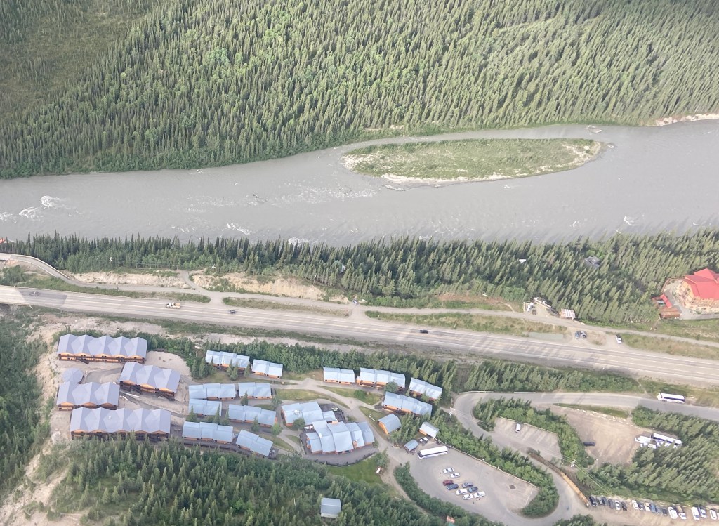 We flew over our Denali Bluffs hotel on the way back to the airport. Several independent buildings on the side of the canyon.