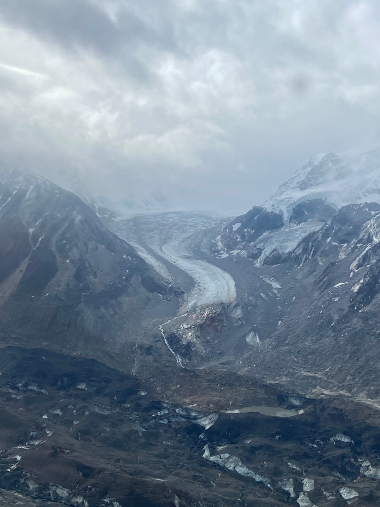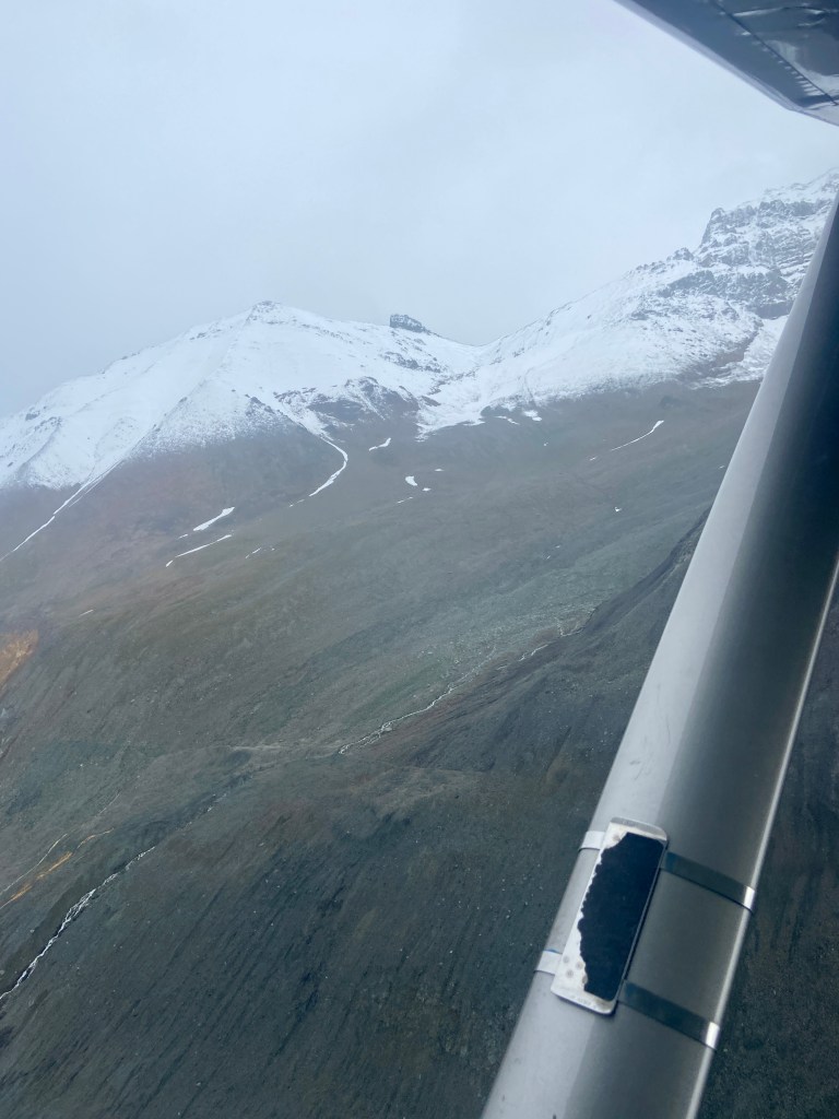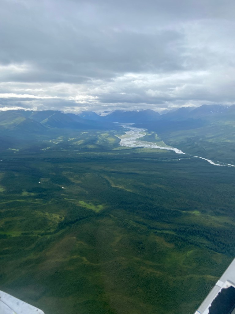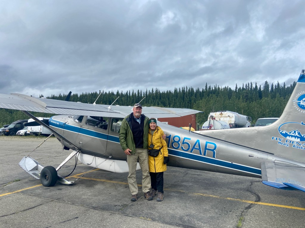 Up early to board the Fly Denali shuttle bus to the Healy River Airport. With the poor weather conditions we toured the Alaskan Range instead of Denali. Disappointing, but we can’t control the weather. With the bad ice conditions on the glacier, we were not able to land on the glacier. Several other people canceled, so they took us up in a very small plane, very uncomfortable for Linda in the back. To balance the weight, I rode in the co-pilot seat of this Cessna 185.