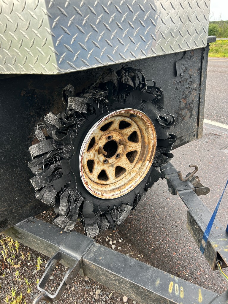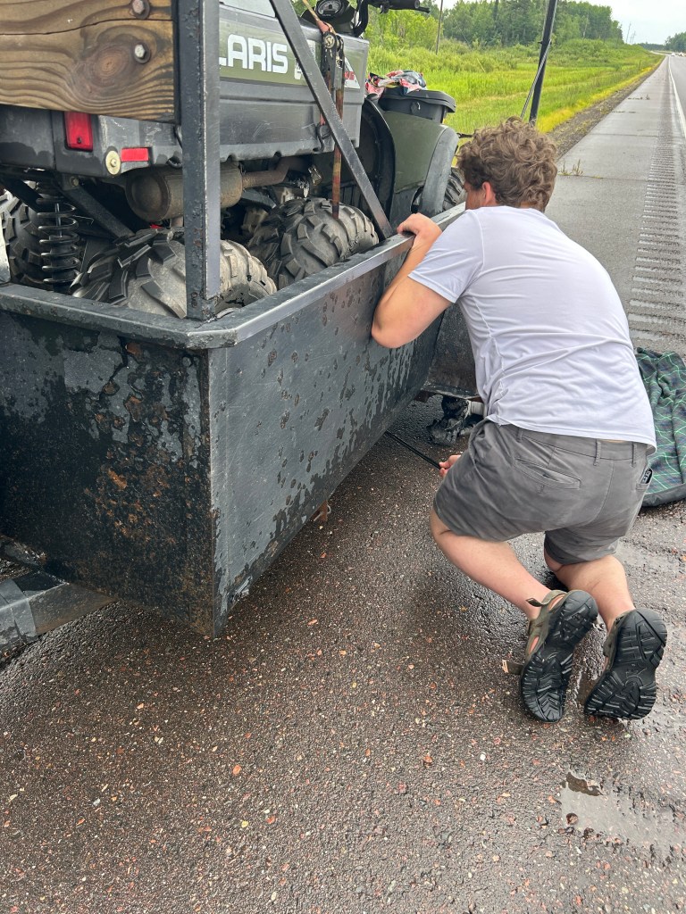 I picked up Alex at 7:45, right on schedule. We blew a tire on the trailer on US 53 near Minong. Not the worst place to watch Alex jack up the trailer and change the tire.