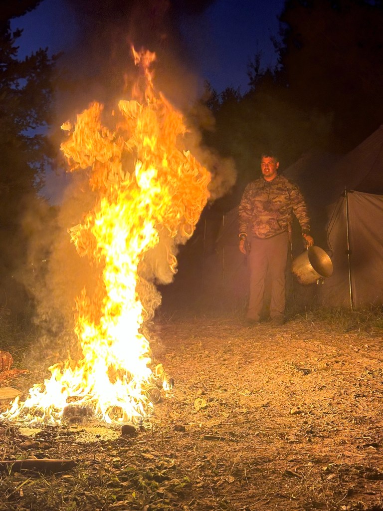 Ken made brats and baked beans for dinner on the Blackstone grill and the kids made a nice fire. Got the tin can going to smelt aluminum cans.
