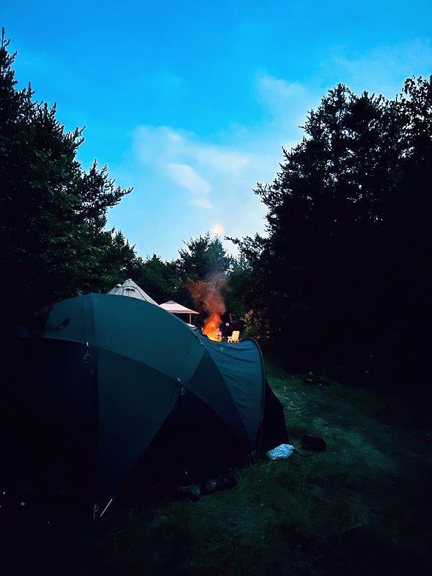 Eric and Ben helped me make blackened walleye fish tacos for dinner. Very tasty! Nice campfire. Beautiful night with an orange glow around the sun.