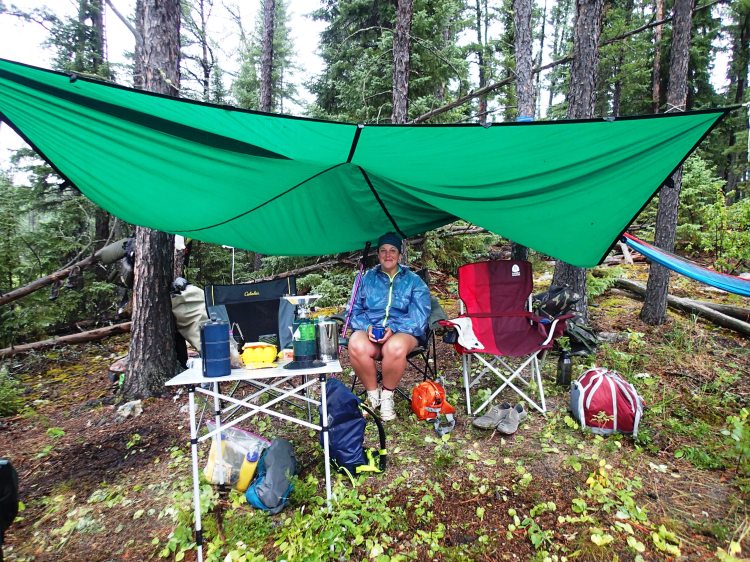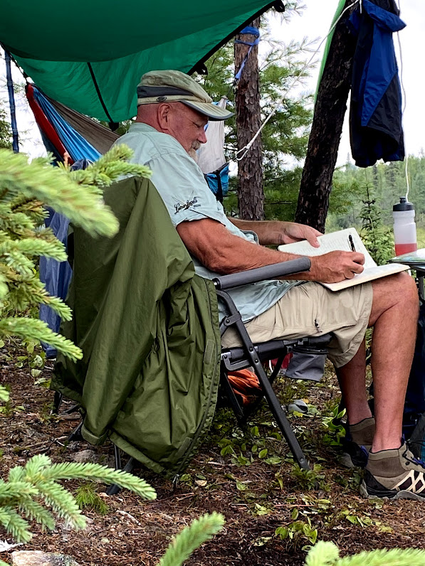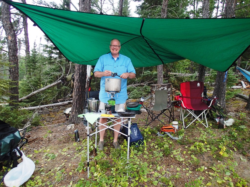 We slept in as a light rain hit the tents. A loon was calling as I started coffee. Very peaceful until I realized that I bought whole bean coffee! Tim poured some beans into a zip lock bag and he cracked the beans with the side of his pocket knife. We enjoyed the coffee under the canopy as the rain picked up as we watched a little mink run along the far bank and swim over to our side. We also saw a big family in 4 canoes looking for an open campsite in the rain, they looked miserable. Glad we found a base camp.