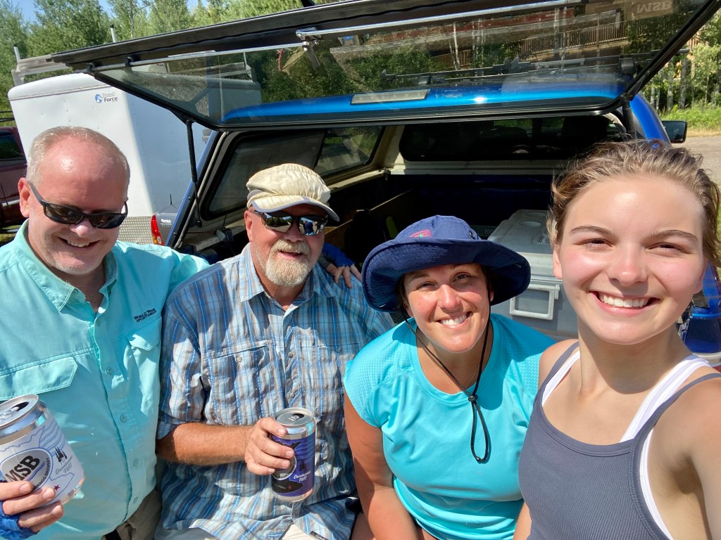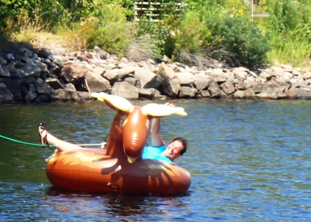 After 5 hours of paddling, we arrived at the landing, loaded the truck and put the canoes on the roof. Tim and I cooled off with the last of his MSB Beers while Kara went for a swim and had a chance to ride a moose!