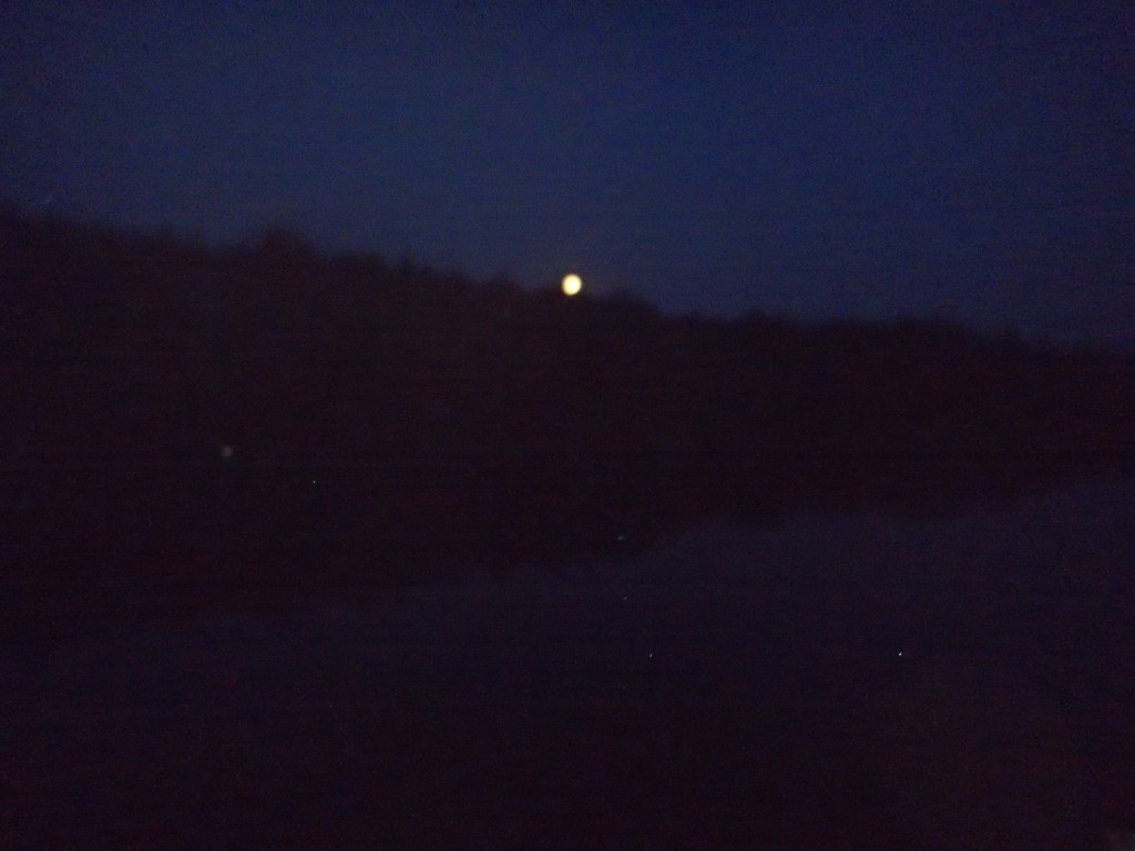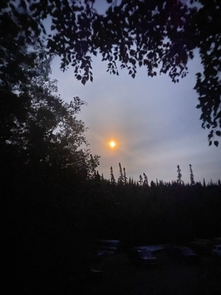 Watched a beaver swim across the smooth lake. Saw a beautiful nearly full moon rise over the trees that had a red haze from the forest fires.