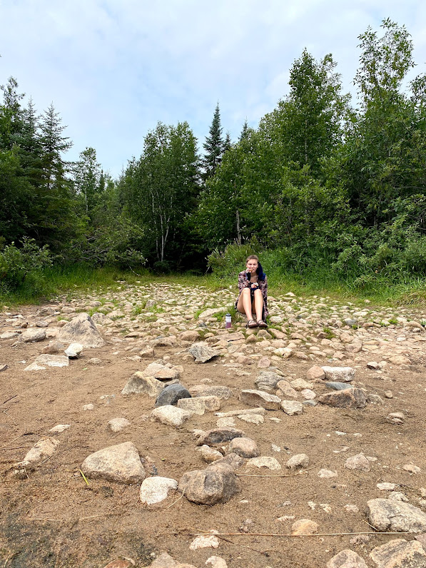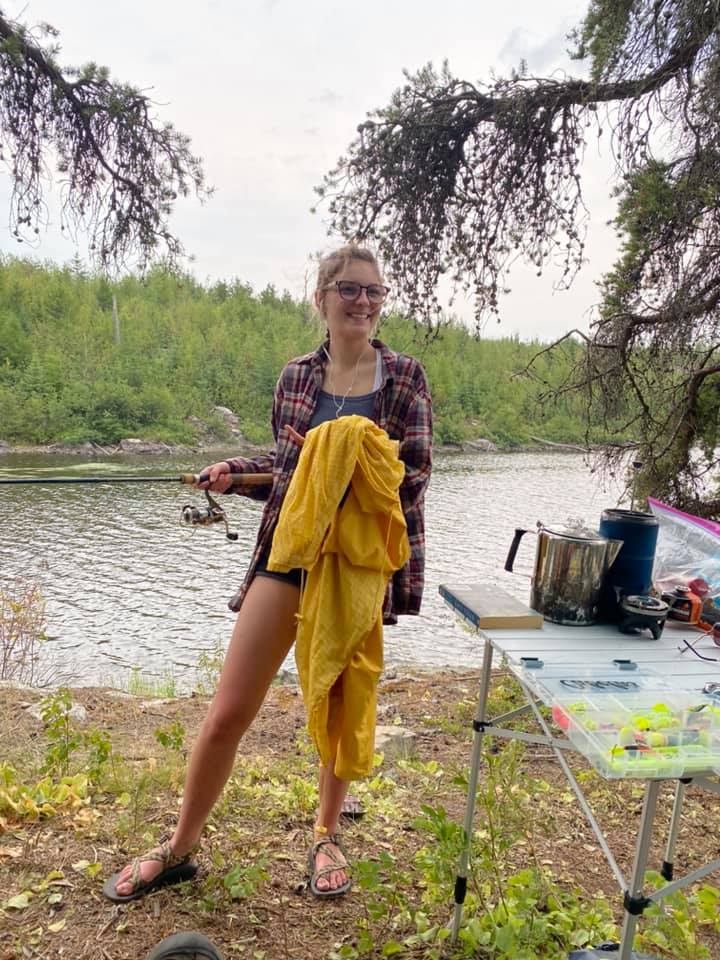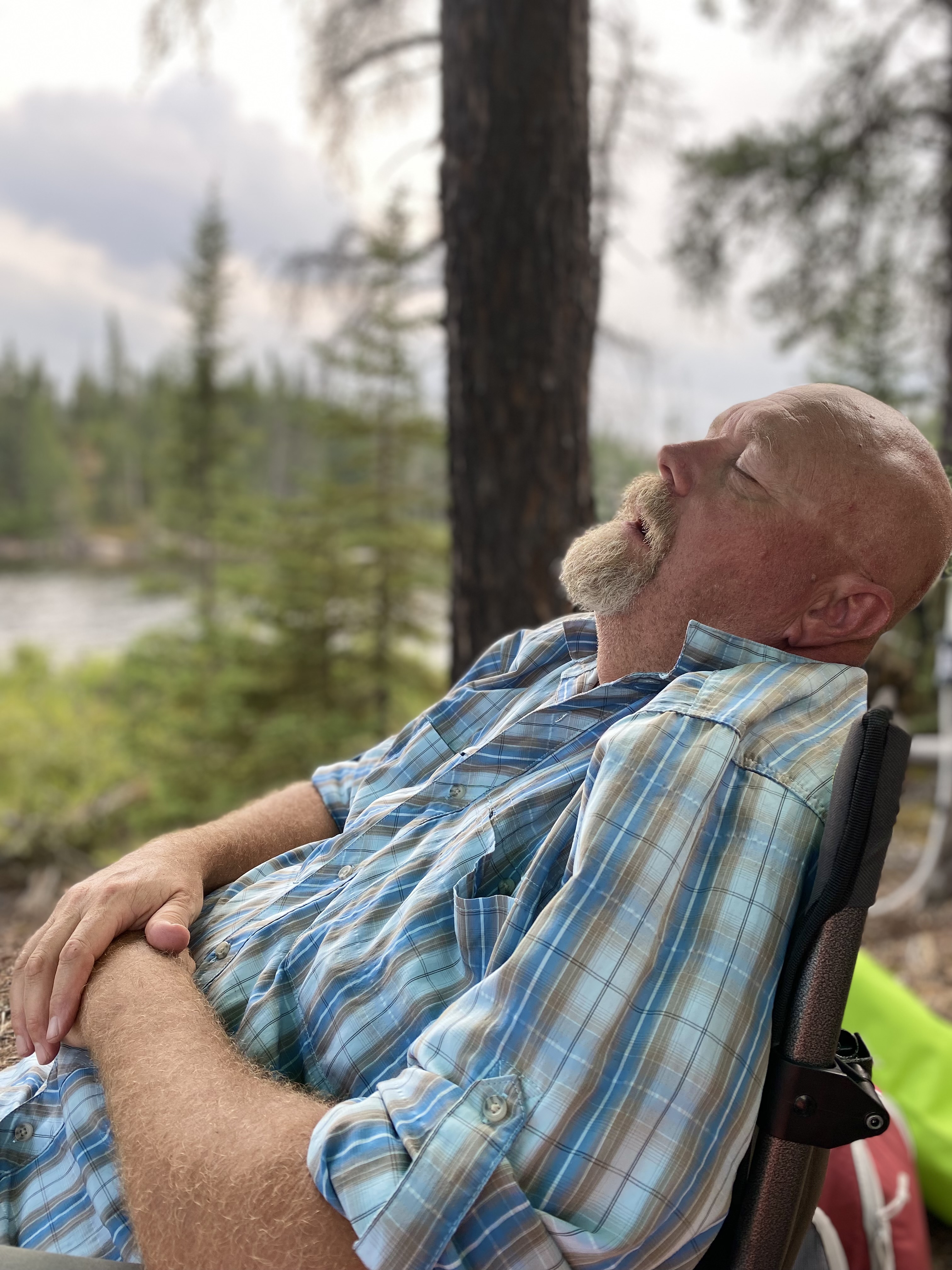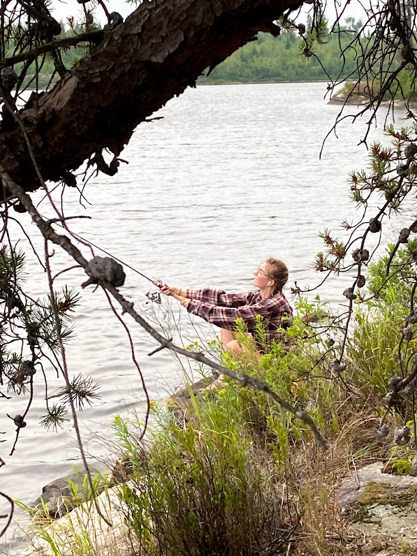 Tim and I portaged the canoe across the 50 rod portage back to Red Rock Lake and paddled back to camp. I changed clothes and enjoyed the breeze from the top of the rock and took a nap. Grace tried to fish from shore while we cooked Mac & Cheese for dinner with Cream Brulee for dessert.