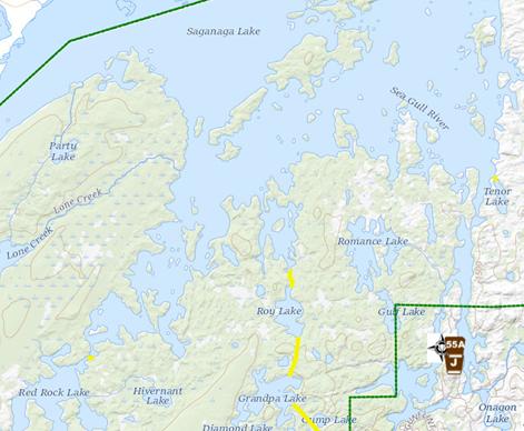We explored the river rapids between Alpine and Sea Gull Lakes. With the low water levels, it would be rocky and slippery adventure to take this shorter, but much more difficult portage.