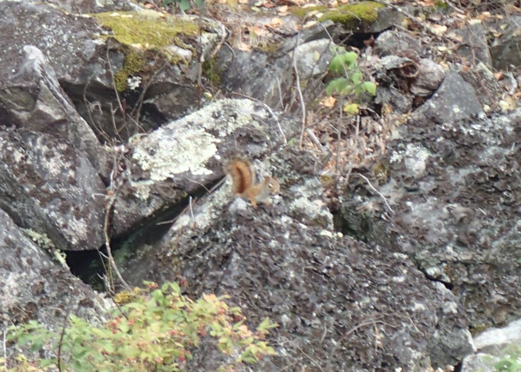 A bald eagle put on quite a show, diving to pickup a fish from the surface of the water while being chased by a smaller bird. A red squirrel stepped out of his rocky home to chatter at us.