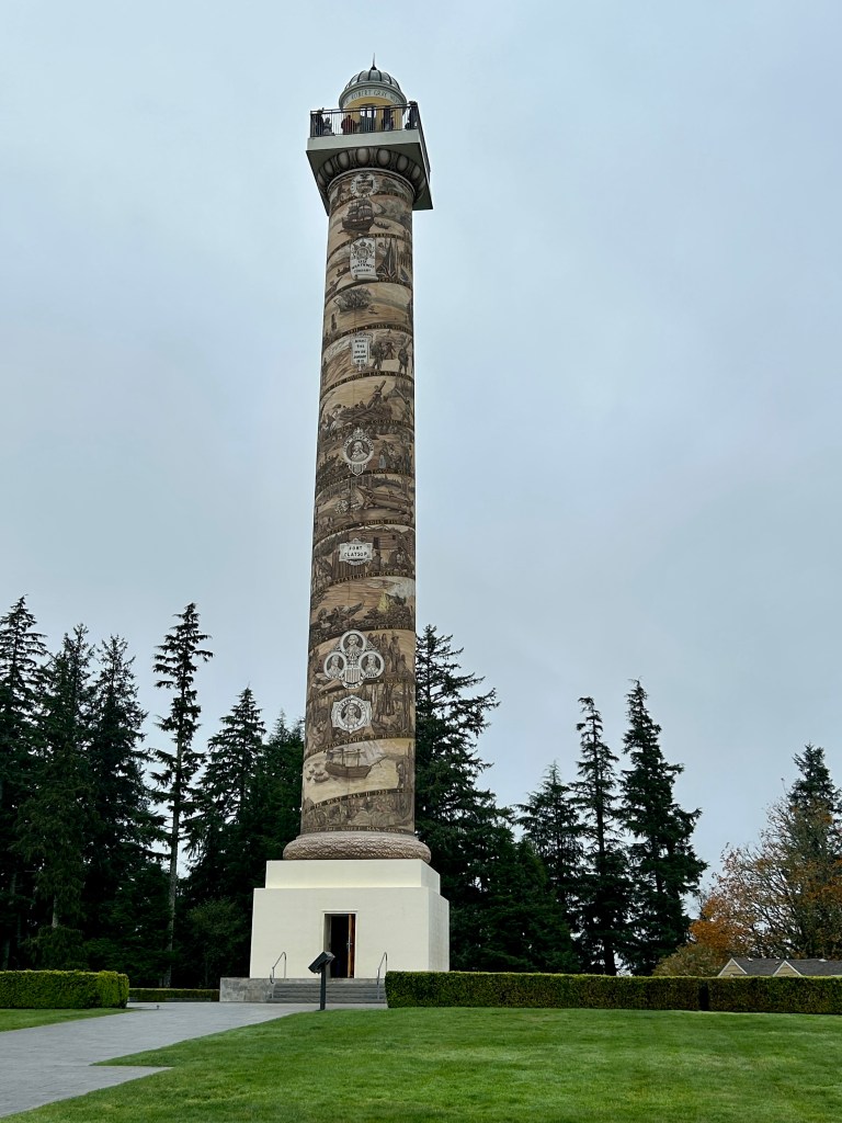 Took bus up to the Astoria Column at the top of the tallest hill in town. Tells the stories of the different explorers who found this place. Gray’s ship the Columbia entered the dangerous mouth of the river in 1792. Lewis and Clark wintered just south of Astoria in 1805-6 at Fort Clatsop.