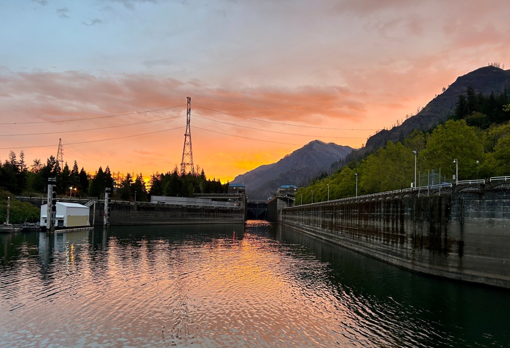 Up at sunrise. The Bonneville Lock has a 70’ rise. Produces 1,200 megawatts of electricity. 670 long 86’ wide.