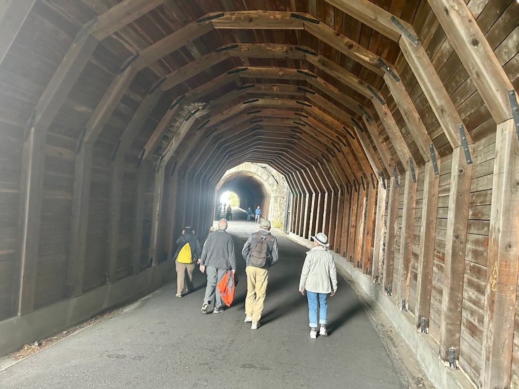 Bus to hike the twin tunnels from Hood River to Mosier. Cool tunnels built in 1921 to finish US highway 30, but replaced by a new wider highway. Made for a nice smooth hiking trail with a modest grade. Rain stopped shortly after we started our hike. Beautiful scenery views of the river and the surrounding bluffs. Learned about poison oak. A 4.75 mile hike.