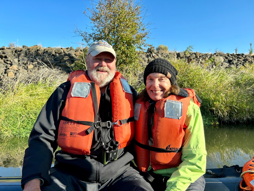 After breakfast, I put on my rain gear to kayak around an island in the Umatilla National Wildlife Refuge. Not much rain, fun to get out on the water. They gave me a tandem kayak and moved a seat to the middle. It worked great! A nice rainbow appeared.