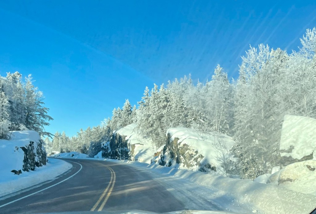 Mark and I had no trouble at the border. The clear blue skies and snow-covered trees were beautiful on the twisty, hilly drive on Hwy 502.