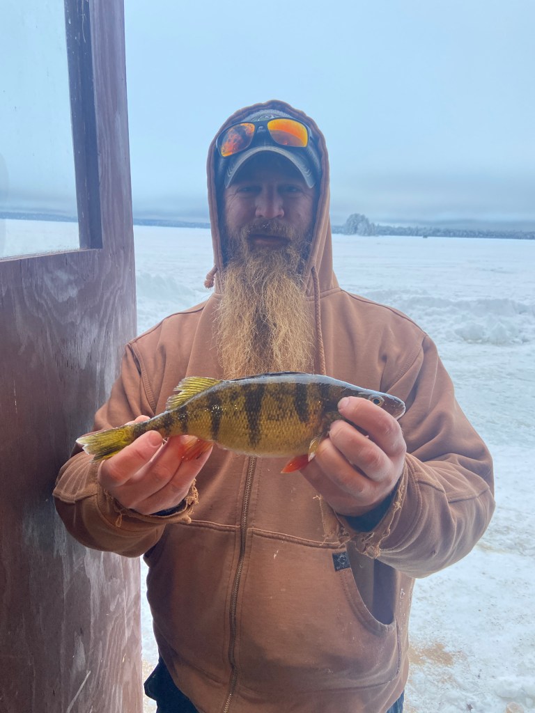 It warmed up to 20 degrees. The early afternoon bite was slow, but action picked up at 3:30. Jeff landed a fat 12″ perch.