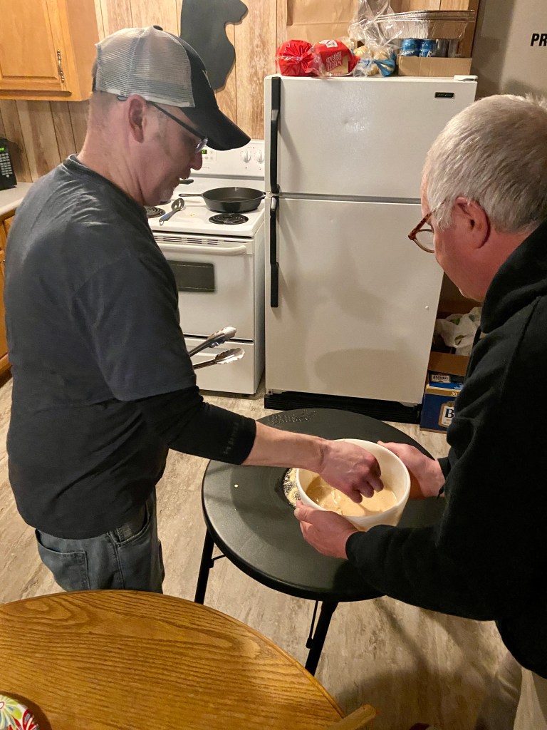Mark, Jeff and I cleaned fish while Dusty made light fluffy biscuits along with sausage with his gravy from scratch. Very tasty! Mark and I took a nap and the rest of the guys went back out on the ice. Fishing was slow in the mid-day sun, but they enjoyed watching a big Muskie swim past their jigs on the Vexilar video camera.