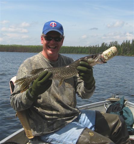 he most unusual way to catch a 40″ Northern was to have it try to swallow a 15″ Walleye on the stringer and get caught on the rope. Andrew was quick with the net and scooped him up!