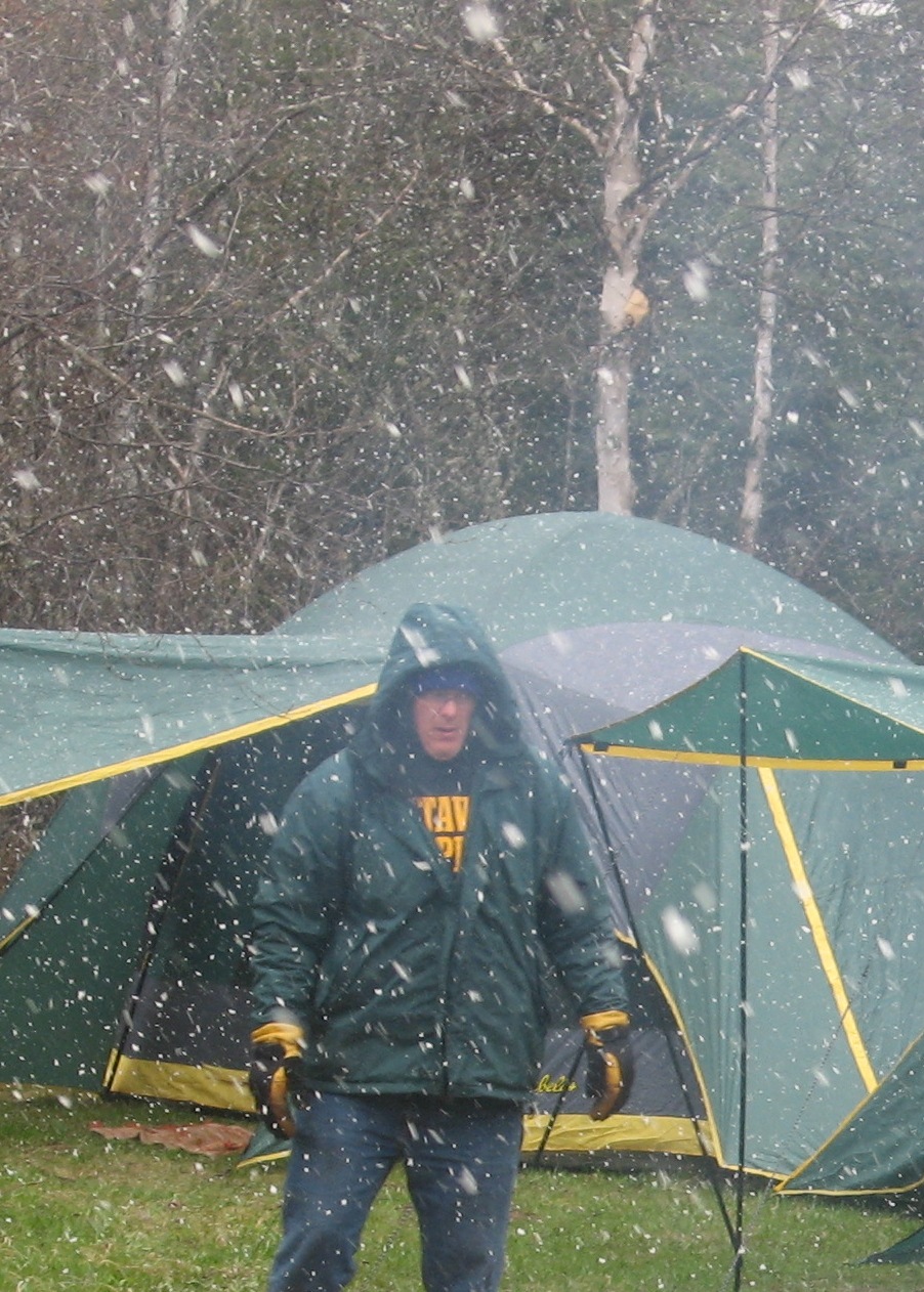 Tim wondered why he got out of the tent. Despite the snow, the men still had work to do. We went through a lot of firewood to stay warm.
