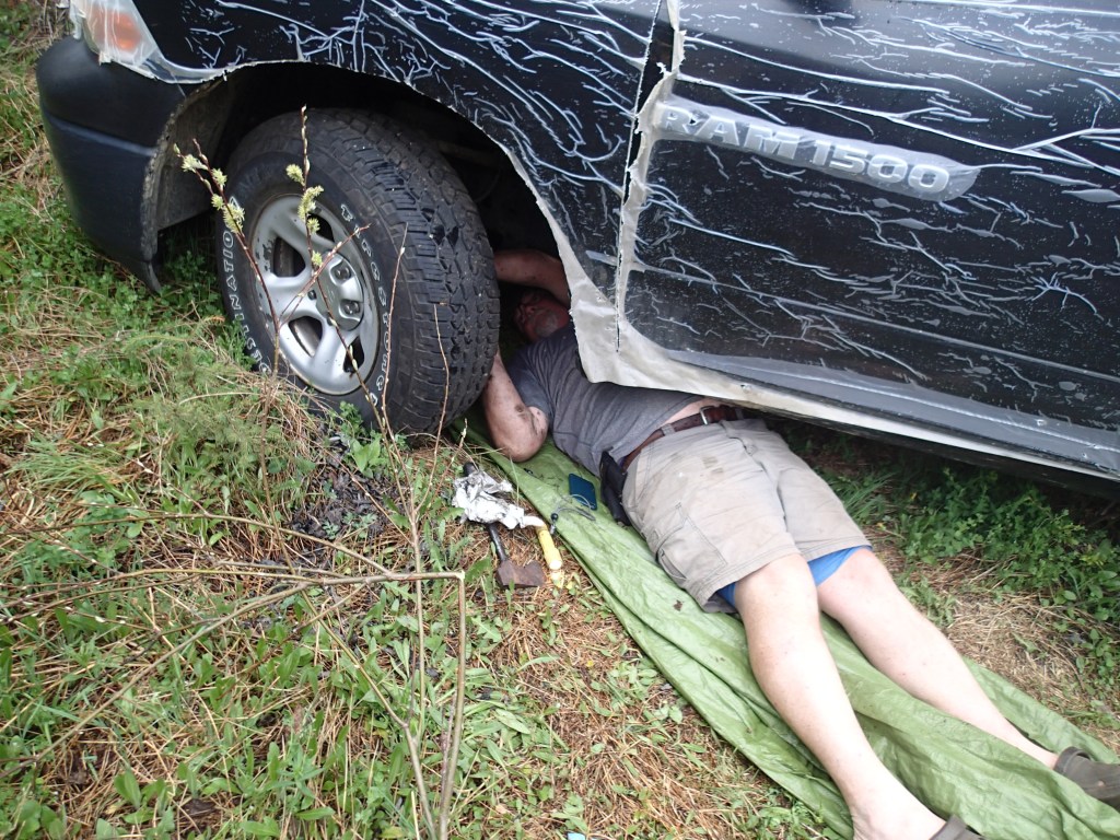Ron climbed under his brother’s truck again. He was not able to pull out the loose rod, but he was able to use some wire to tie down the loose rod to the leaf springs. Hoping that it would make it home.