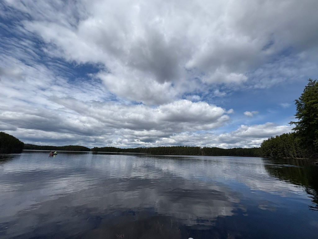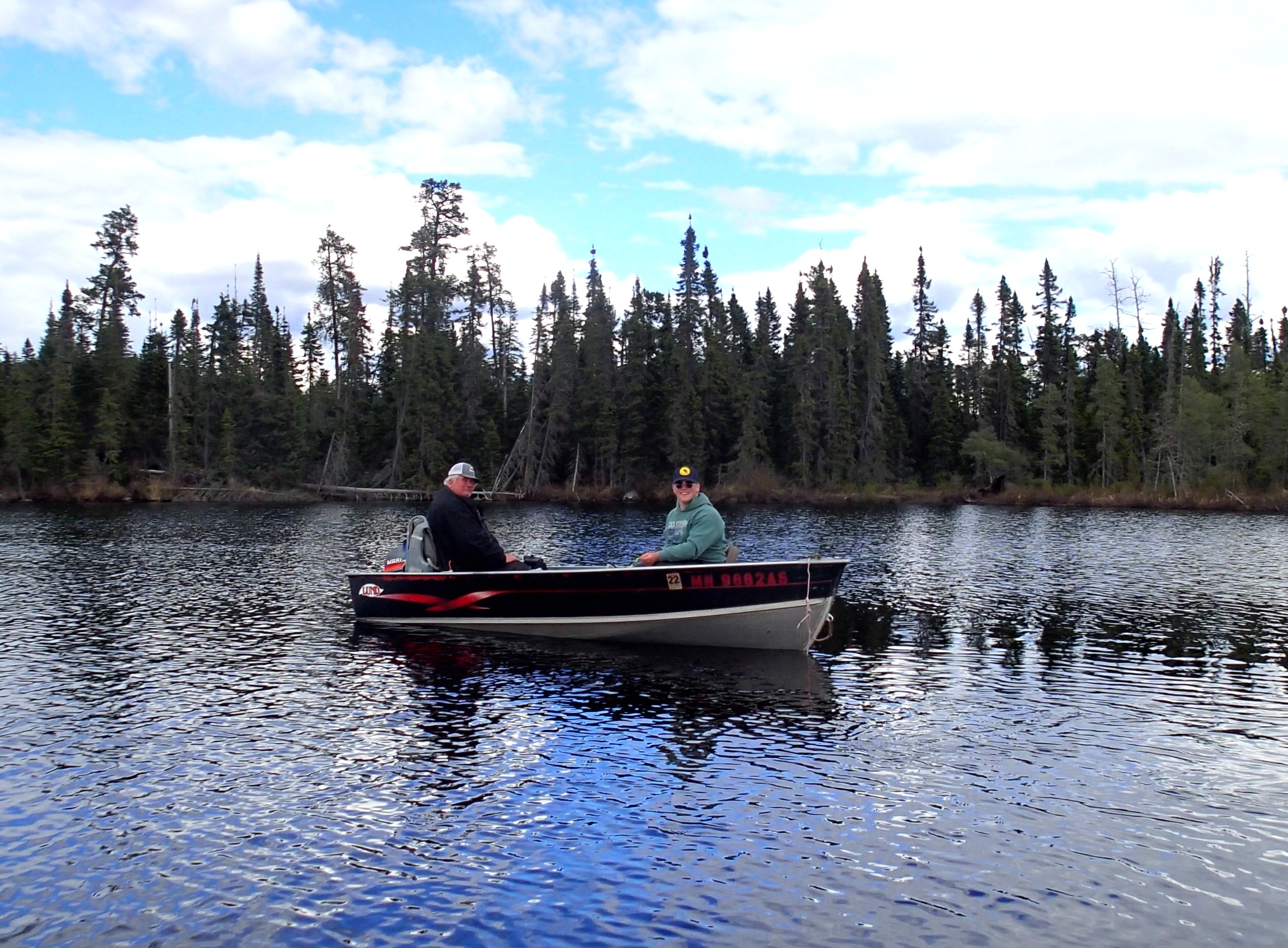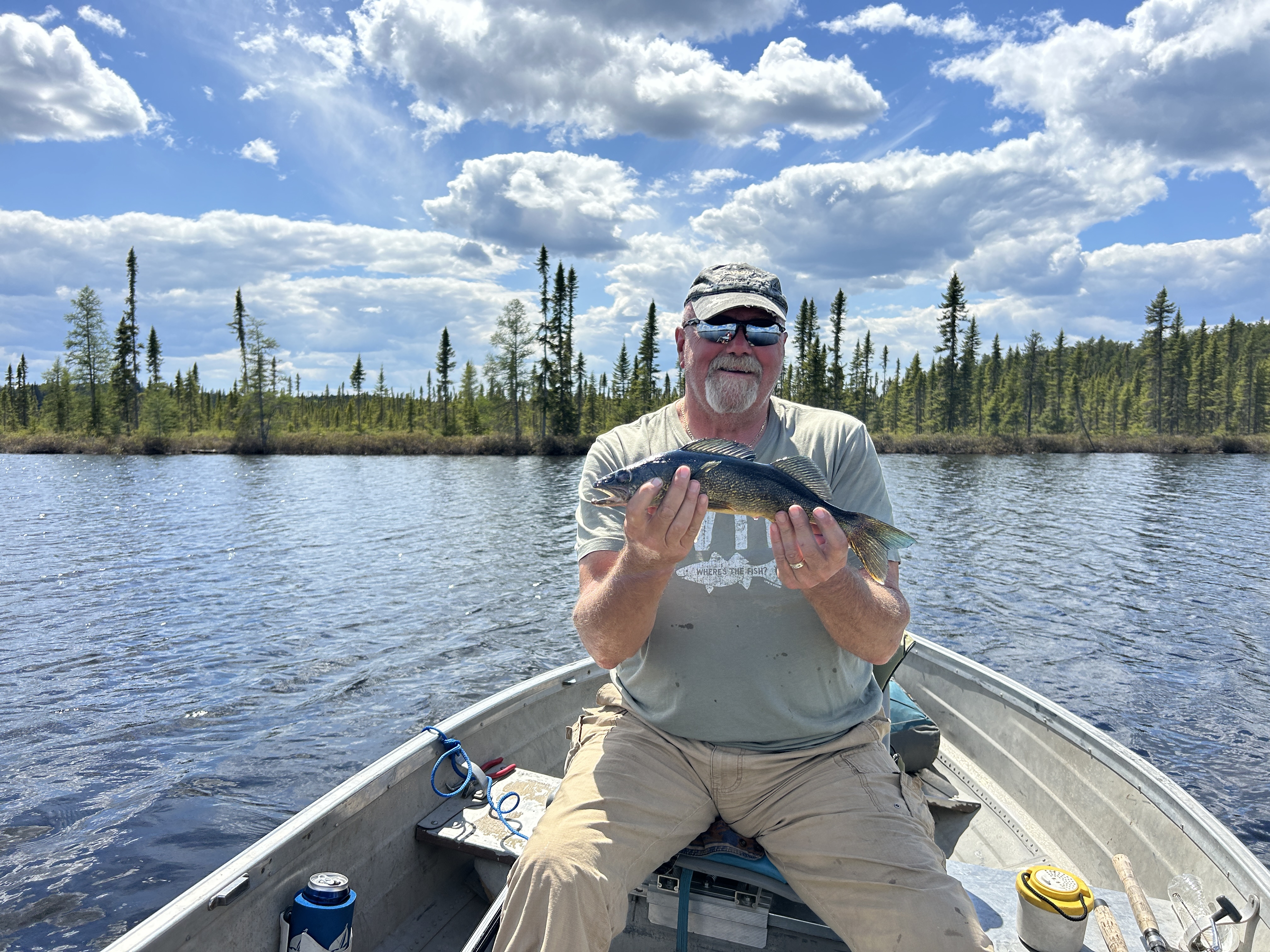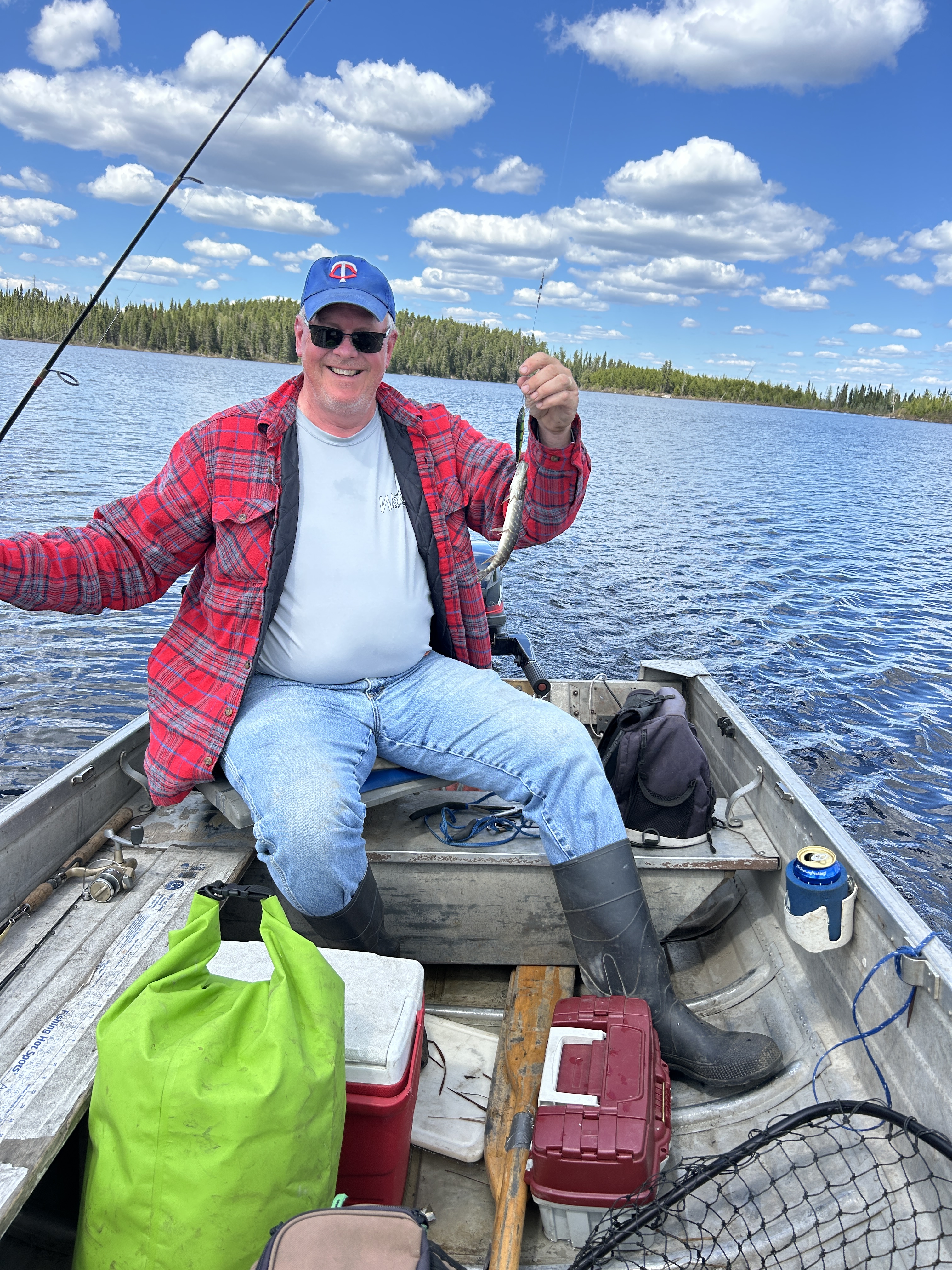Cool, overcast morning. Biscuits and gravy hit the spot! Lots of Grouse drumming in the woods. We got the boats in the water and loaded our fishing gear. The motors started up right away, but the prop on John’s boat blew as soon as he tried to accelerate, so I went back to camp with the 6-wheeler and got my spare 15hp Mercury working for him. We hit the water on a calm morning with a mix of clouds and blue skies.