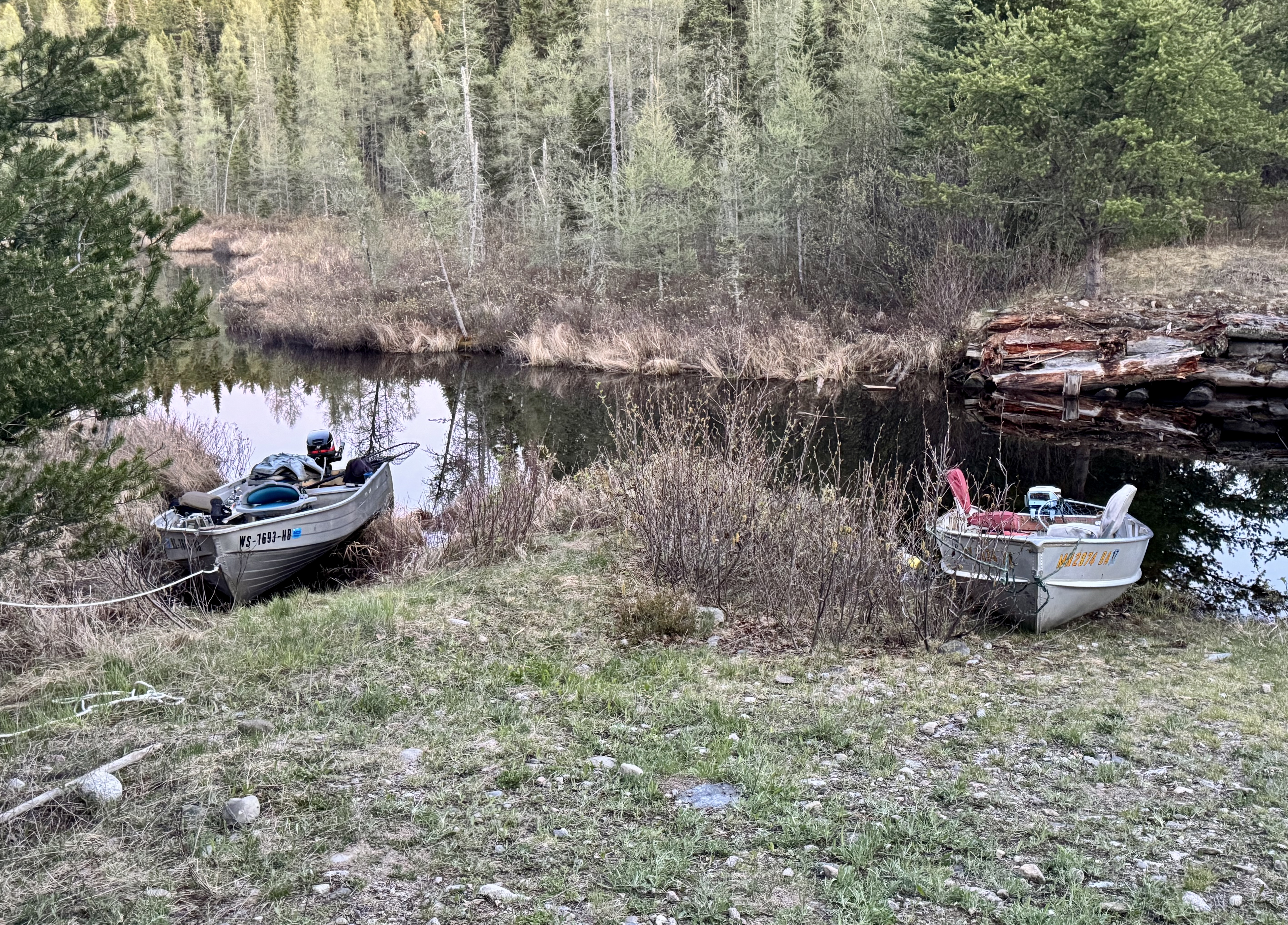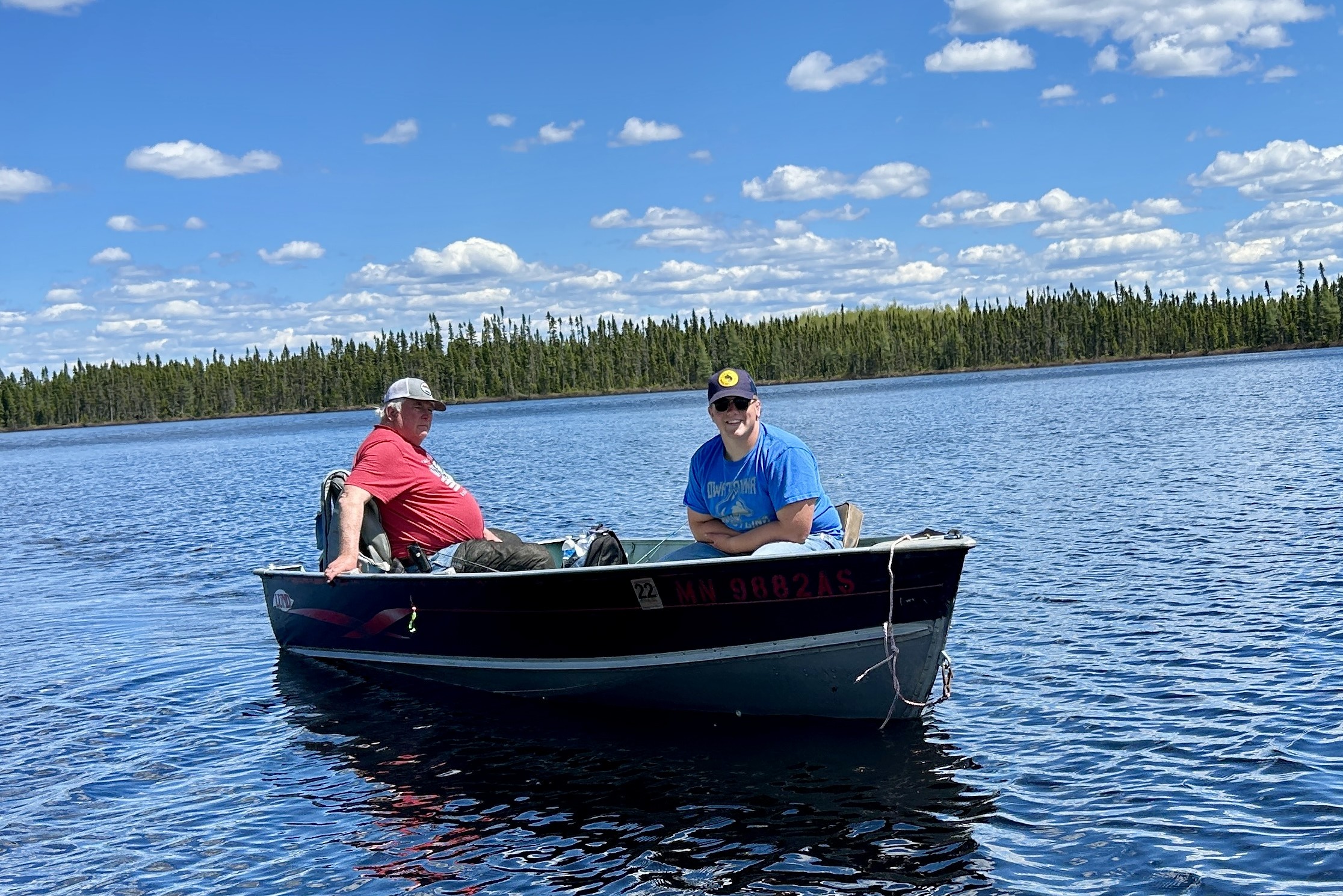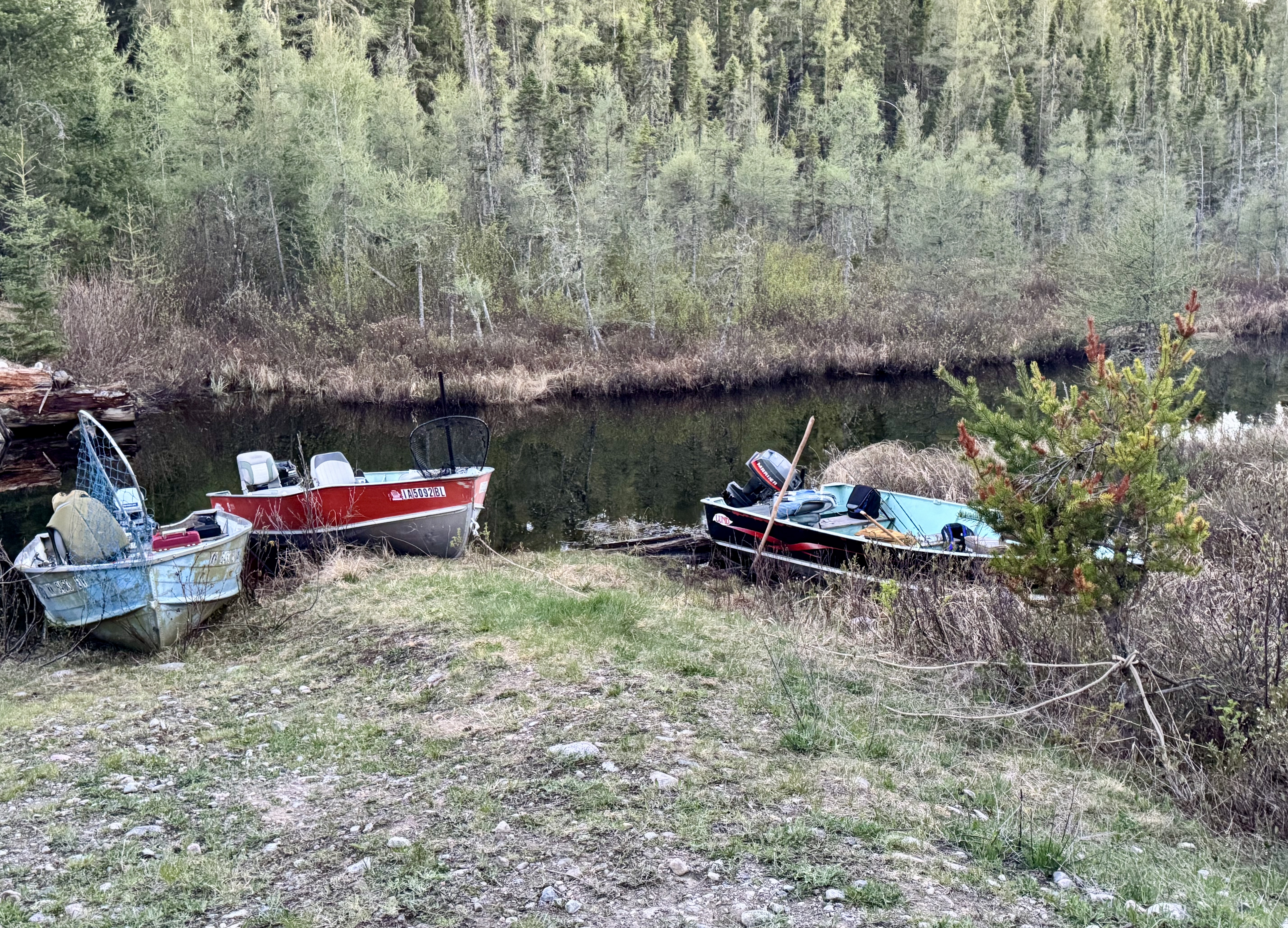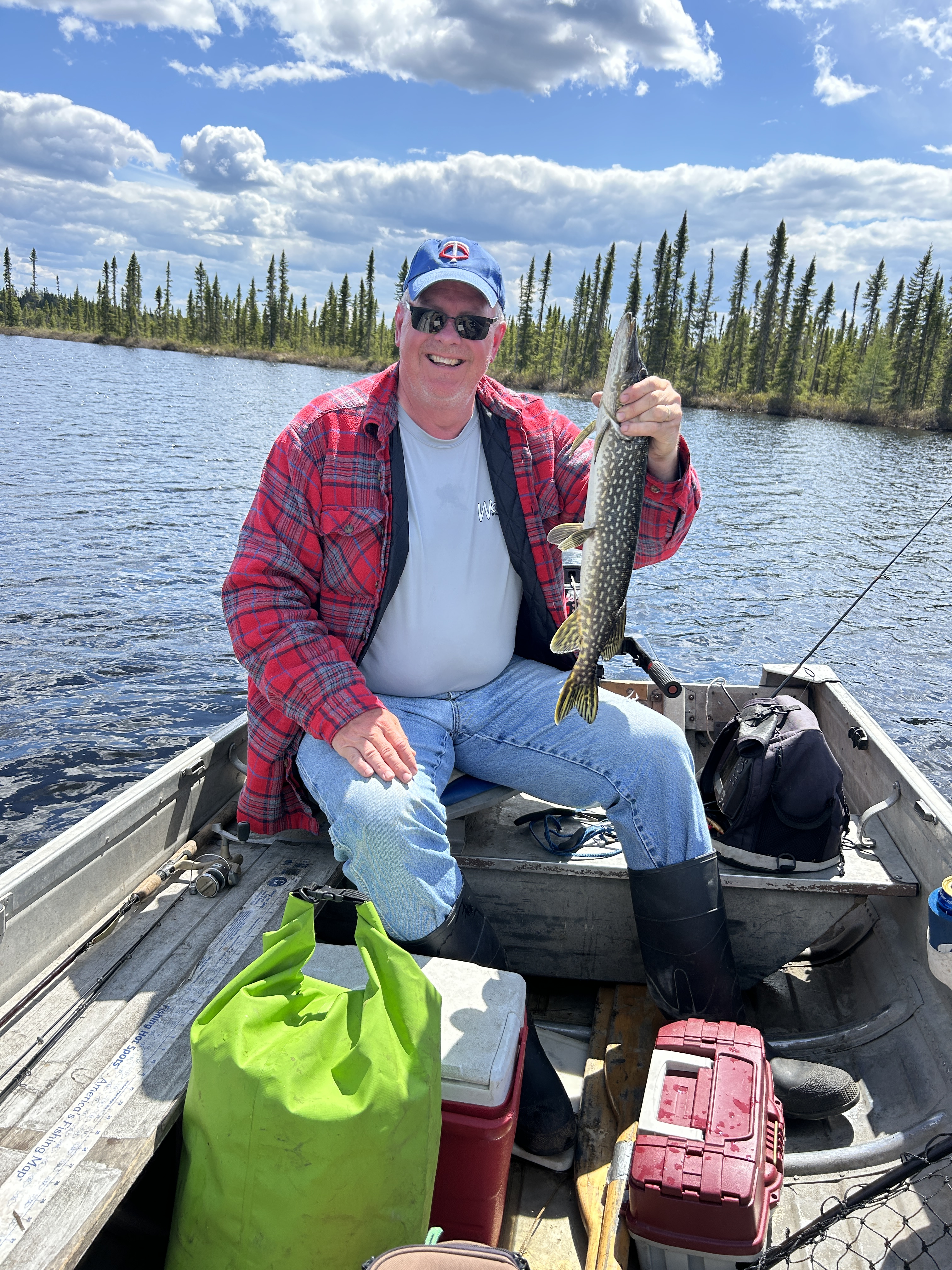 Cool, overcast morning. Biscuits and gravy hit the spot! Lots of Grouse drumming in the woods. We got the boats in the water and loaded our fishing gear. The motors started up right away, but the prop on John’s boat blew as soon as he tried to accelerate, so I went back to camp with the 6-wheeler and got my spare 15hp Mercury working for him. We hit the water on a calm morning with a mix of clouds and blue skies.