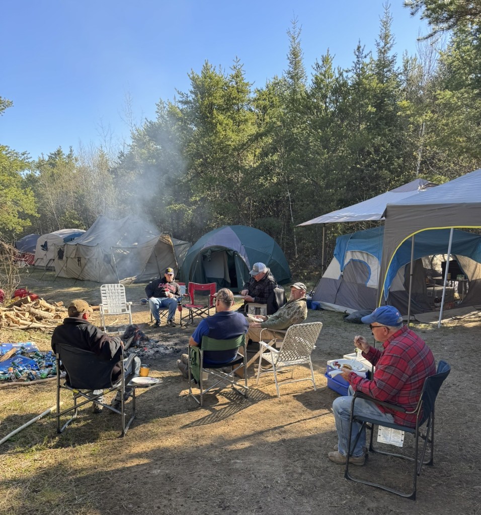 The group gathered together around the fire at the end of a cool, but clear day. Enjoyed brats and baked beans. Listened to the loons call across the lake and watched a big flock of geese fly overhead.