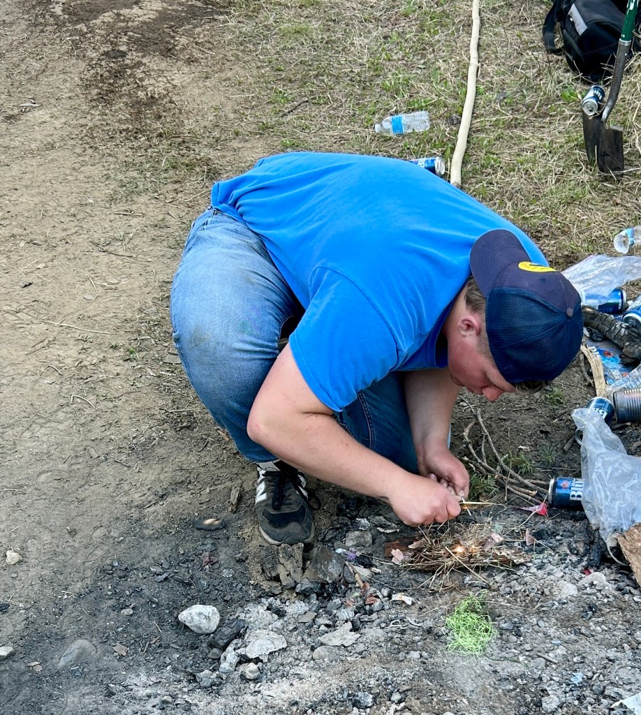 Max started the fire with his flint and his knife – old school!