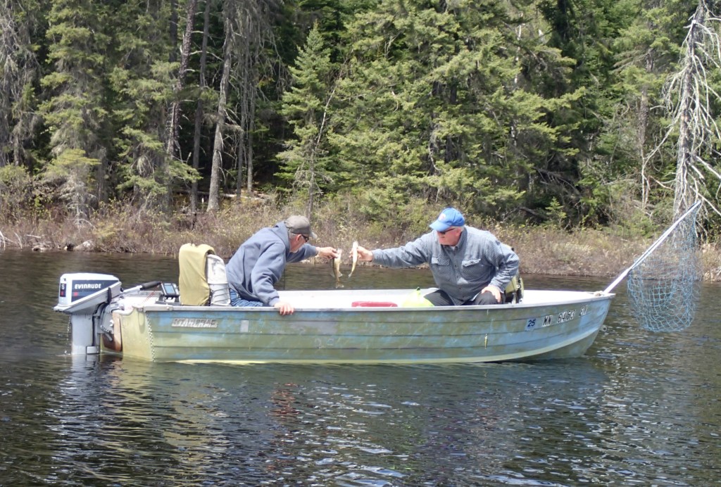 Tim and Mark had no luck fishing on Clear Jack Lake, but broke through the beaver dam to make it easier for the rest of us. Tim’s bottom bouncer was not effective, so he “leased” a Rapala from Mark and started catching fish. Ken caught a nice 22″ Walleye and a 27″ Northern.