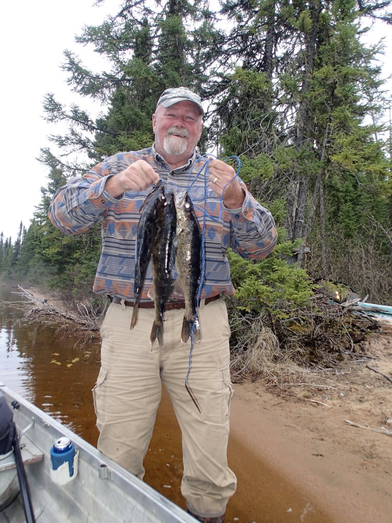 Ken saw a moose and a small calf in the water. The cow got very anxious as they heard a wolf howl. Max cleaned fish and left the stringer attached to the carcass!