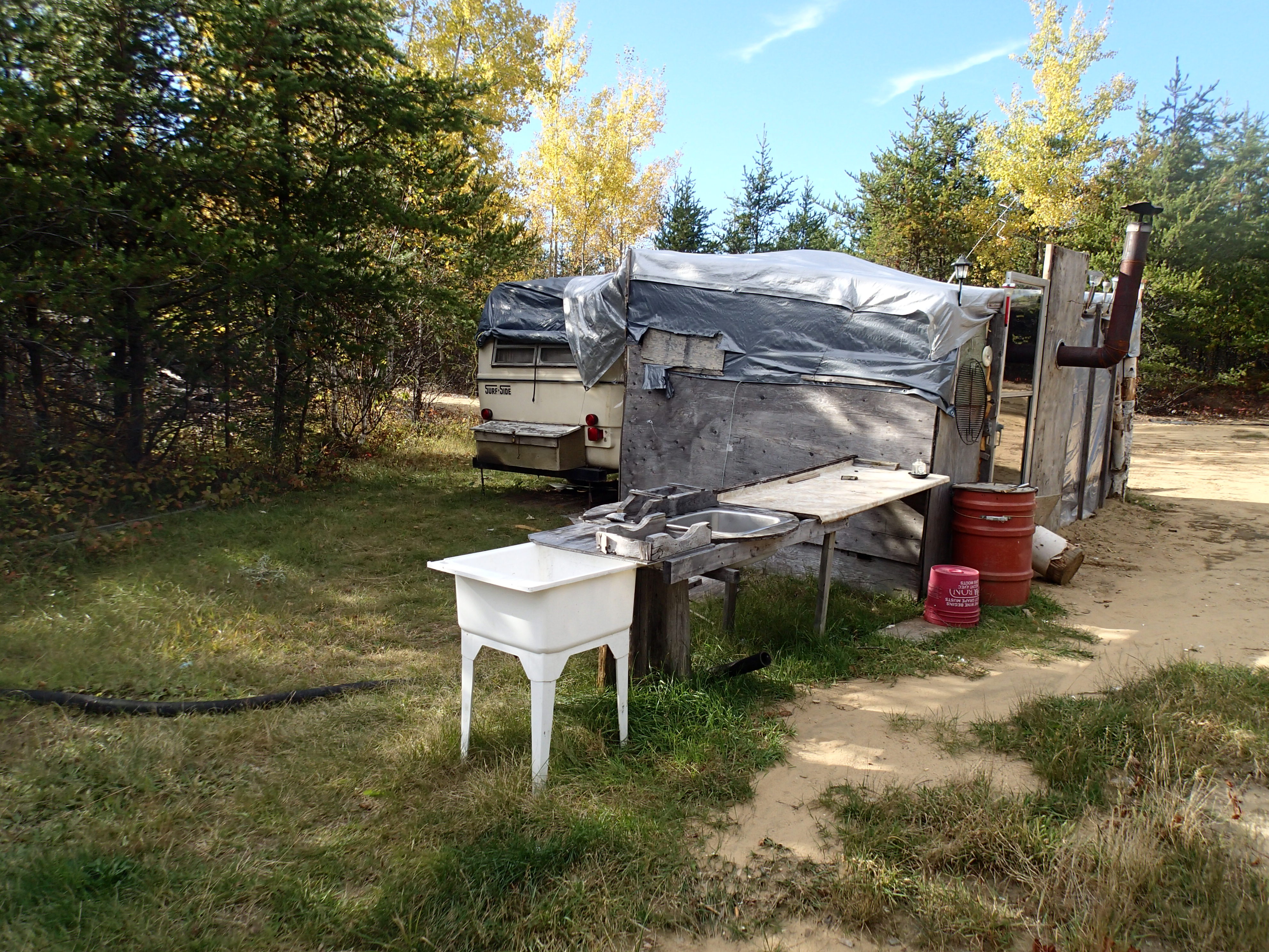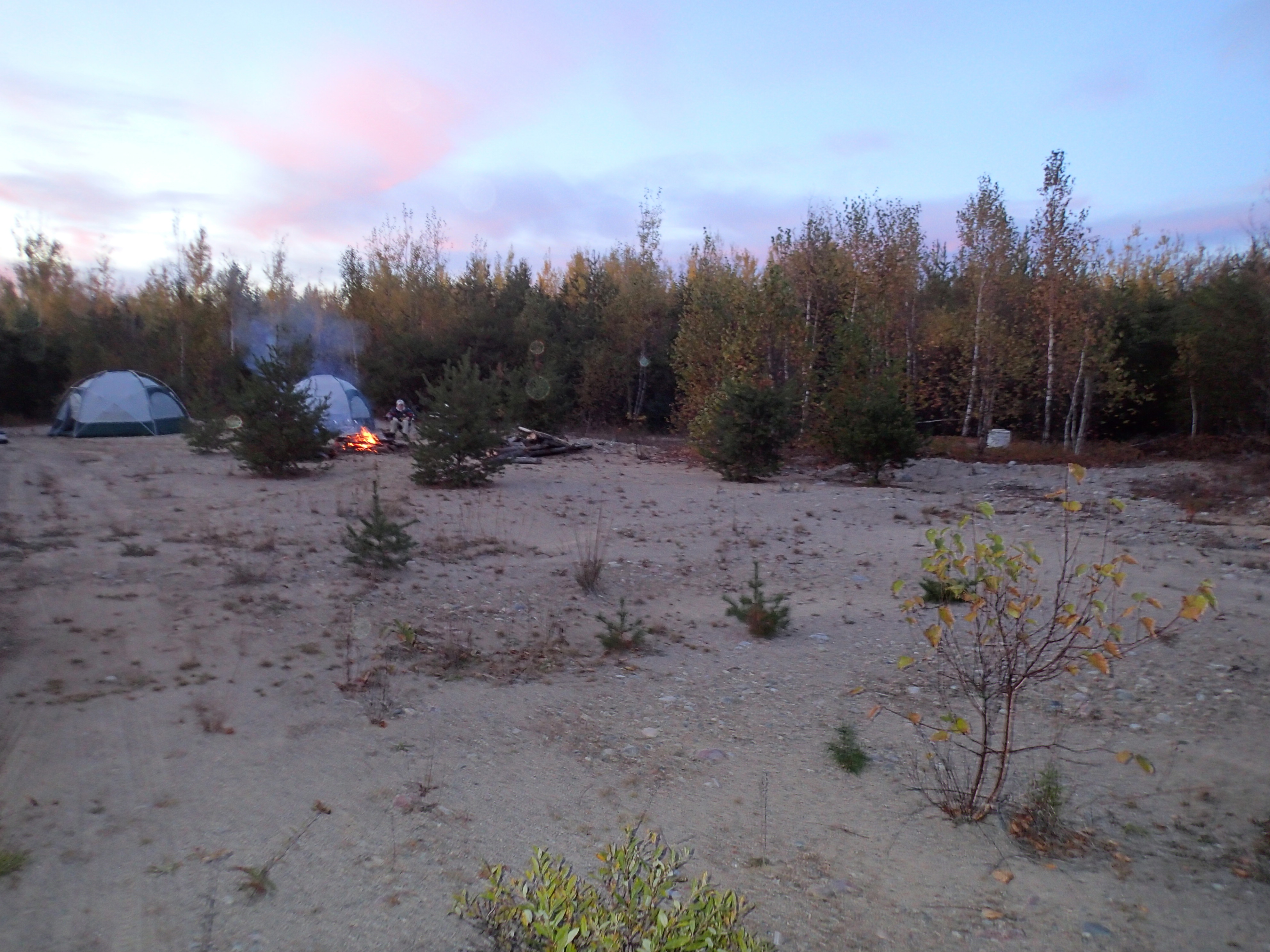 A large sandy campsite was excellent for our large group, but 6 miles from the best lake access. Sunny and 55 during the day and 20 at night – hard frost on the windshield – froze the dish water in the pot – cold!