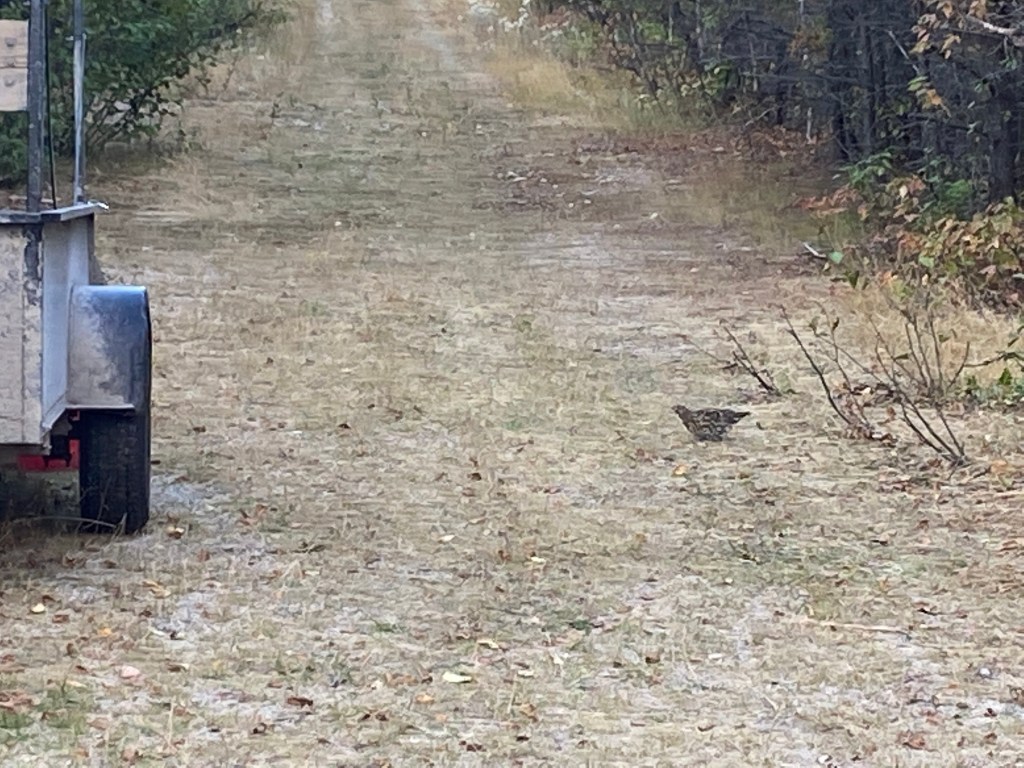 John headed west and I headed south. John shot two Spruce Grouse and I shot another Ruffed Grouse. After 45 minutes, we met back and I shot a Ruffed and a Spruce Grouse on our walk back to the 6-wheeler. I got one more as we drove to meet Jim. Jim left a marker in the road to make sure we knew which way he was traveling.