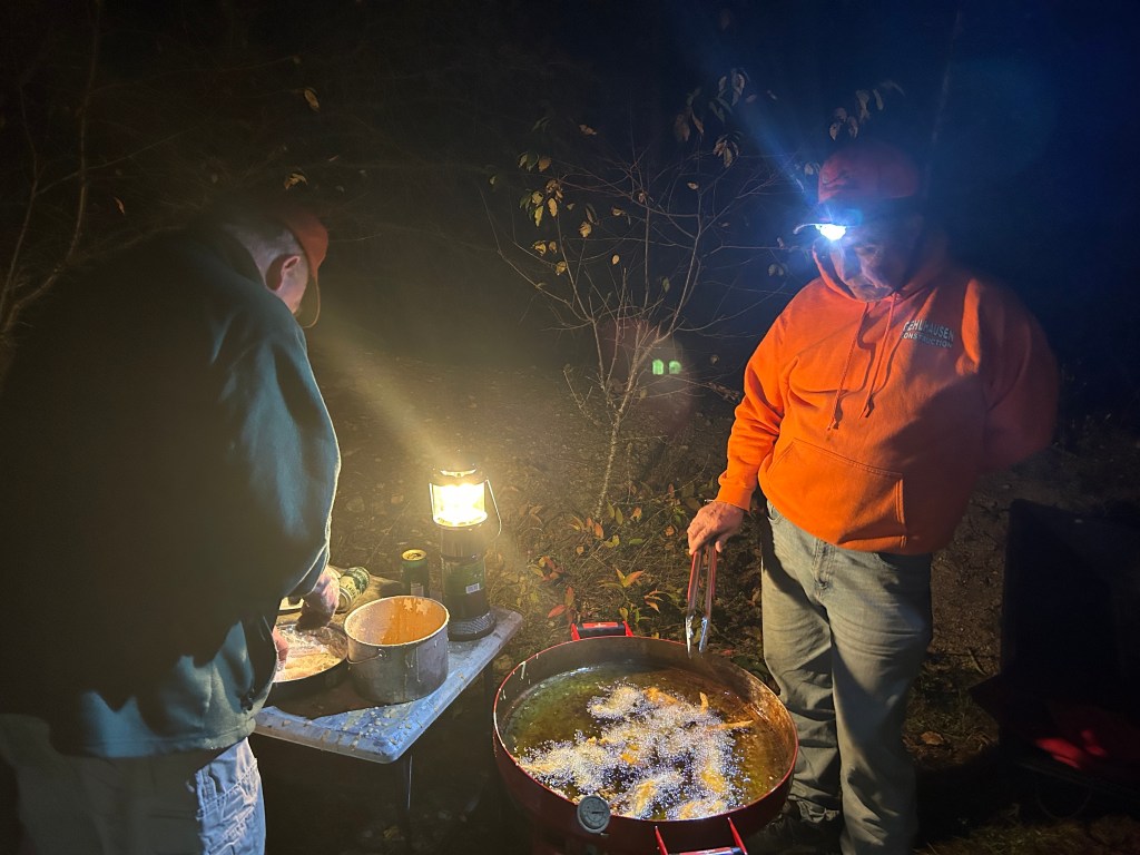Despite the wet weather, we had a nice campfire. Even better after John and Jim dumped the hot oil on the fire!