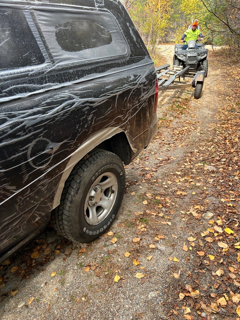 When we got back to camp, we realized that Zack’s ATV has just a 1″ receiver, so we did not have a trailer hitch for the ATV. Mark used his truck to haul the boats down to the lake. A tight squeeze!