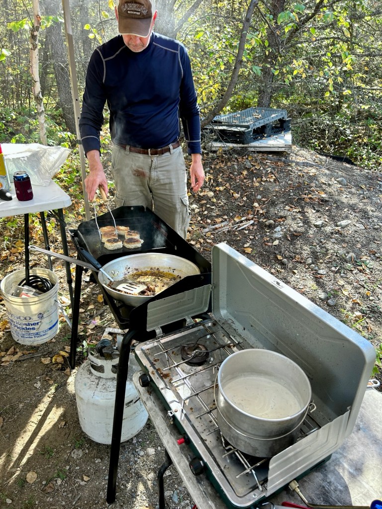 Clear, cool and damp morning. Heavy dew on the tents. John saw two grouse while walking to the bathroom, he went back to his truck and pulled out his shotgun and shot both of them.