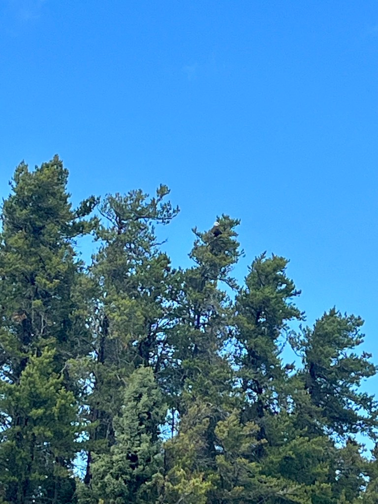We washed dishes and we were on the water shortly after noon. Three big men, two outboard motors, gas and gear made for slow going. Warm, sunny day with no wind made for tough fishing, but we picked up 5 nice eating sized fish for dinner. Out pet bald eagle followed us as we tried several fishing spots.